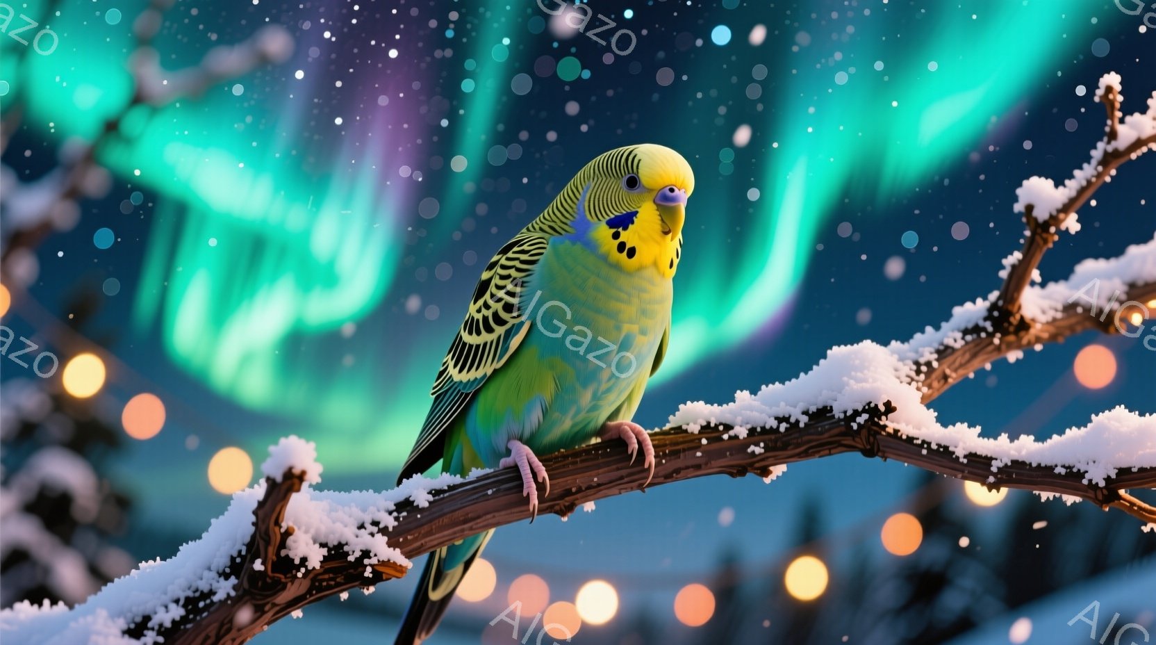 インコが雪で覆われた枝に止まっています。その羽は鮮やかな青、緑、黄色が混ざり合い、冬の風景の中で際立っています。背景にはオーロラのような光が広がり、幻想的で穏やかな雰囲気を醸し出しています。