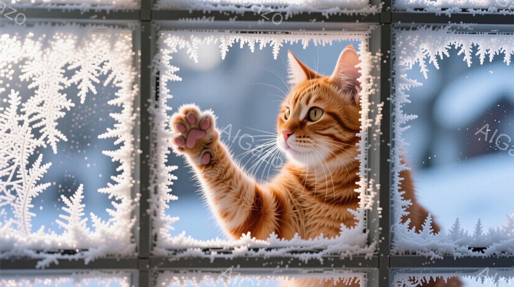 窓枠に寄りかかり、オレンジ色の縞模様の猫が前足を伸ばして何かを掴もうとしている様子が写っている。背景は雪景色で、窓ガラスには霜が降りており、冬の寒々とした雰囲気を醸し出している。猫の表情は好奇心旺盛で、遊び心に満ちている。