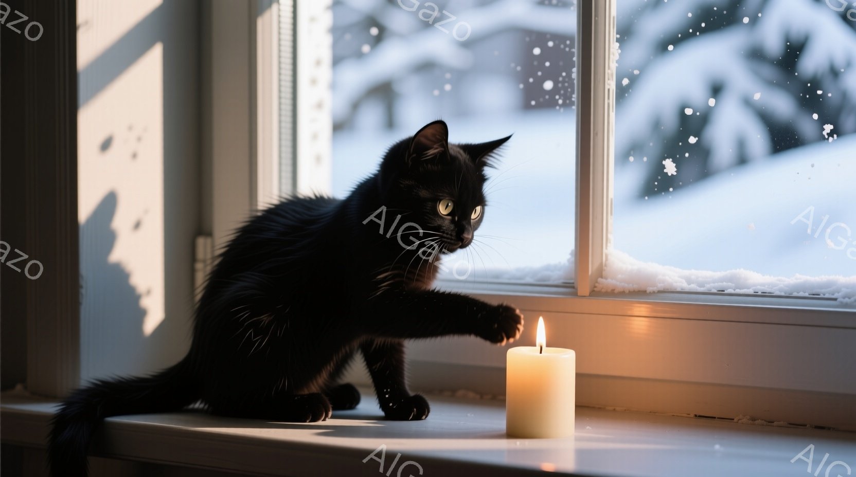 黒猫が窓辺の白い棚の上を歩いています。背景には雪が降る冬景色が見え、棚の上には数本の点灯した白いキャンドルが並んでいます。温かい光と雪景色が組み合わさり、静かで穏やかな雰囲気を醸し出しています。