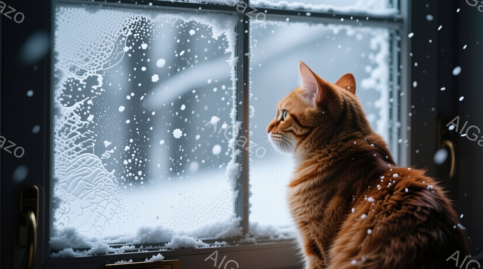 オレンジ色の毛並みの猫が窓辺に座り、外の雪景色をじっと見つめている。窓枠は白く、雪が降り積もる冬の風景がぼんやりと見える。猫はリラックスした姿勢で、静かで穏やかな冬の雰囲気を醸し出している。