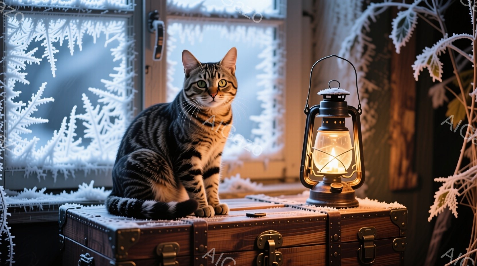 茶色の縞模様の猫が、霜で覆われた木の箱の上に座って正面を見つめています。背景には、霜で覆われた窓枠と、ぼんやりと光るランタンが見え、冬の静かで穏やかな雰囲気を醸し出しています。全体的に、暖かく落ち着いた、冬の日のひとコマを切り取ったような印象を与えます。
