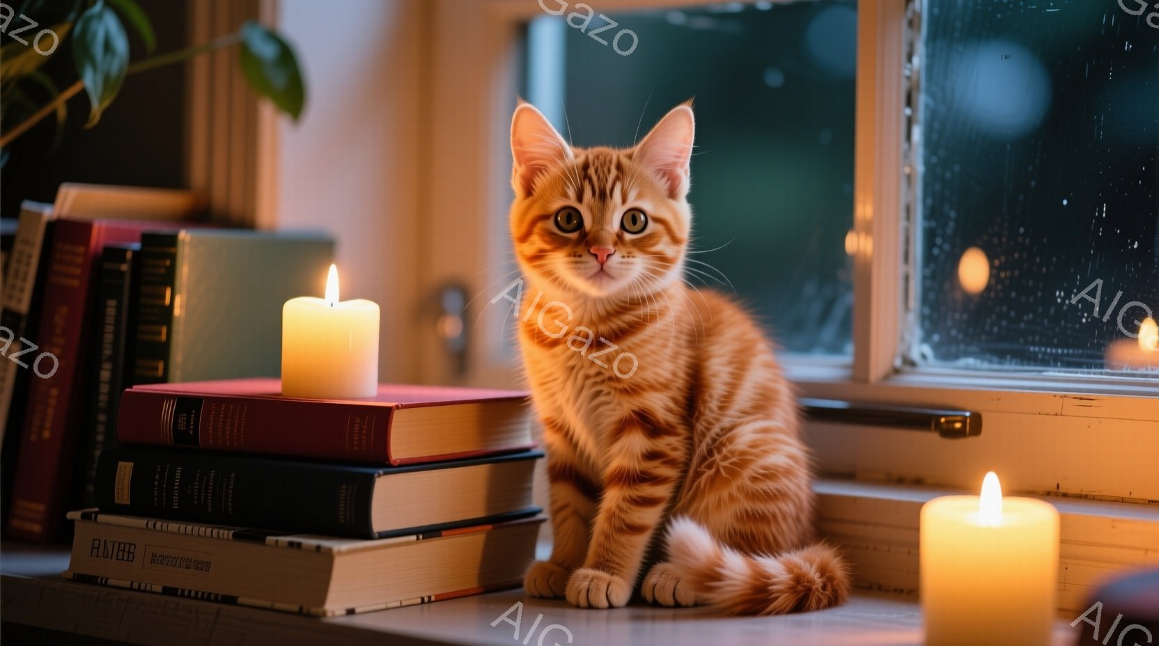 暖炉のそばの窓辺に、オレンジ色の毛並みの猫が座っています。猫は好奇心旺盛な表情でカメラを見つめ、積み重ねられた本の上に鎮座しています。背景には雨が降る夜のぼやけた街並みが広がり、周囲には穏やかで暖かい雰囲気が漂っています。