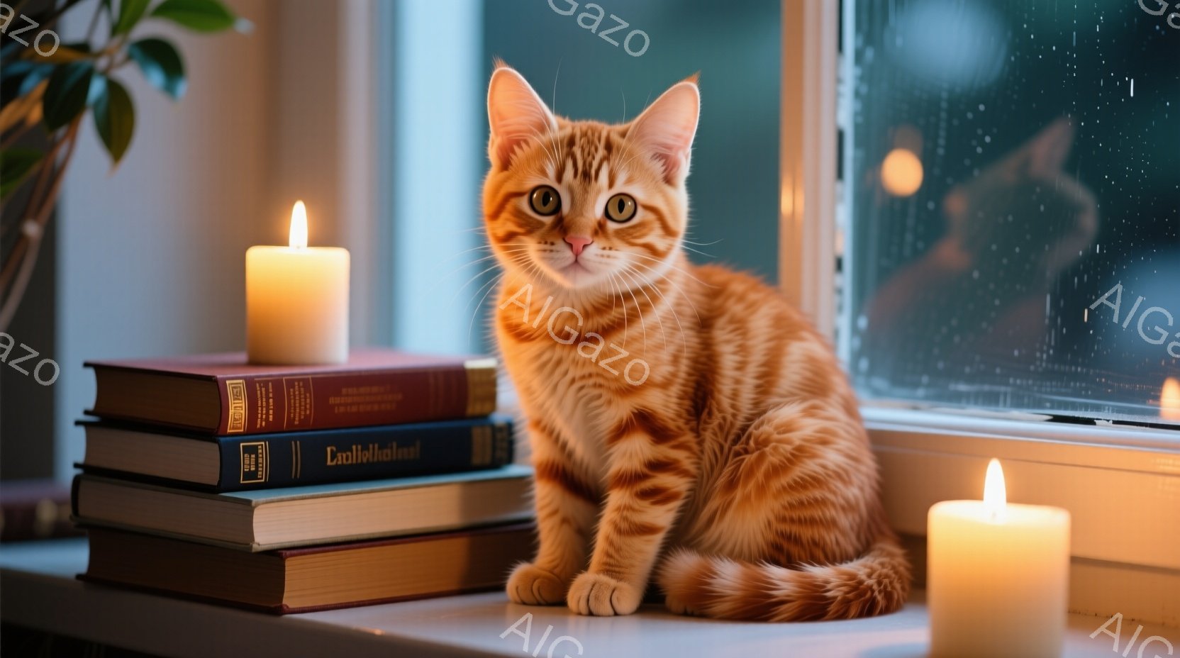 オレンジ色のキティが、積み重ねられた本の上で座っています。窓の外は雨が降っており、ぼんやりとした背景が広がっています。柔らかい光を放つキャンドルが2本、キティの左右に置かれ、温かく落ち着いた雰囲気を醸し出しています。