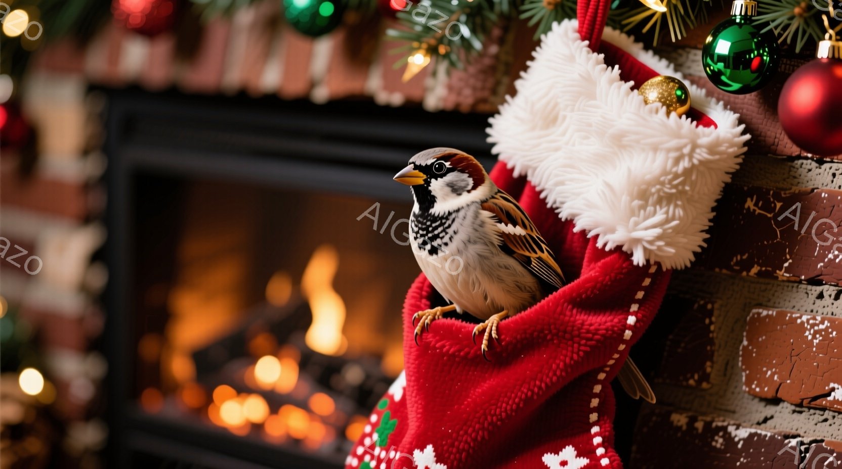一つの小さなスズメが、赤いクリスマスストッキングの中にちょこんと座っています。ストッキングの縁にはふわふわの白い毛皮がついており、背景にはぼんやりとした暖炉とクリスマスツリーの飾りが確認できます。全体的に暖かく、お祝いムードに満ちた雰囲気です。