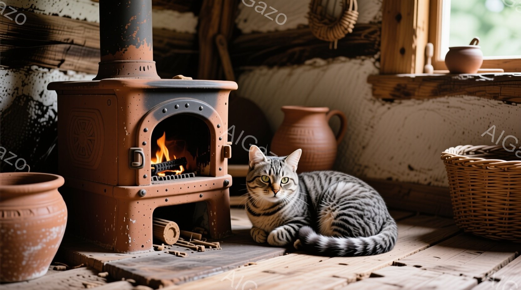 暖炉のそばに灰色の猫が丸まって座っており、穏やかな表情でこちらを見ている。背景には、素朴な木製の床、編まれたバスケット、そして暖炉の赤色の熱が暖かさを感じさせる。全体的に、静かで心地よい、リラックスした家庭の雰囲気が漂っている。