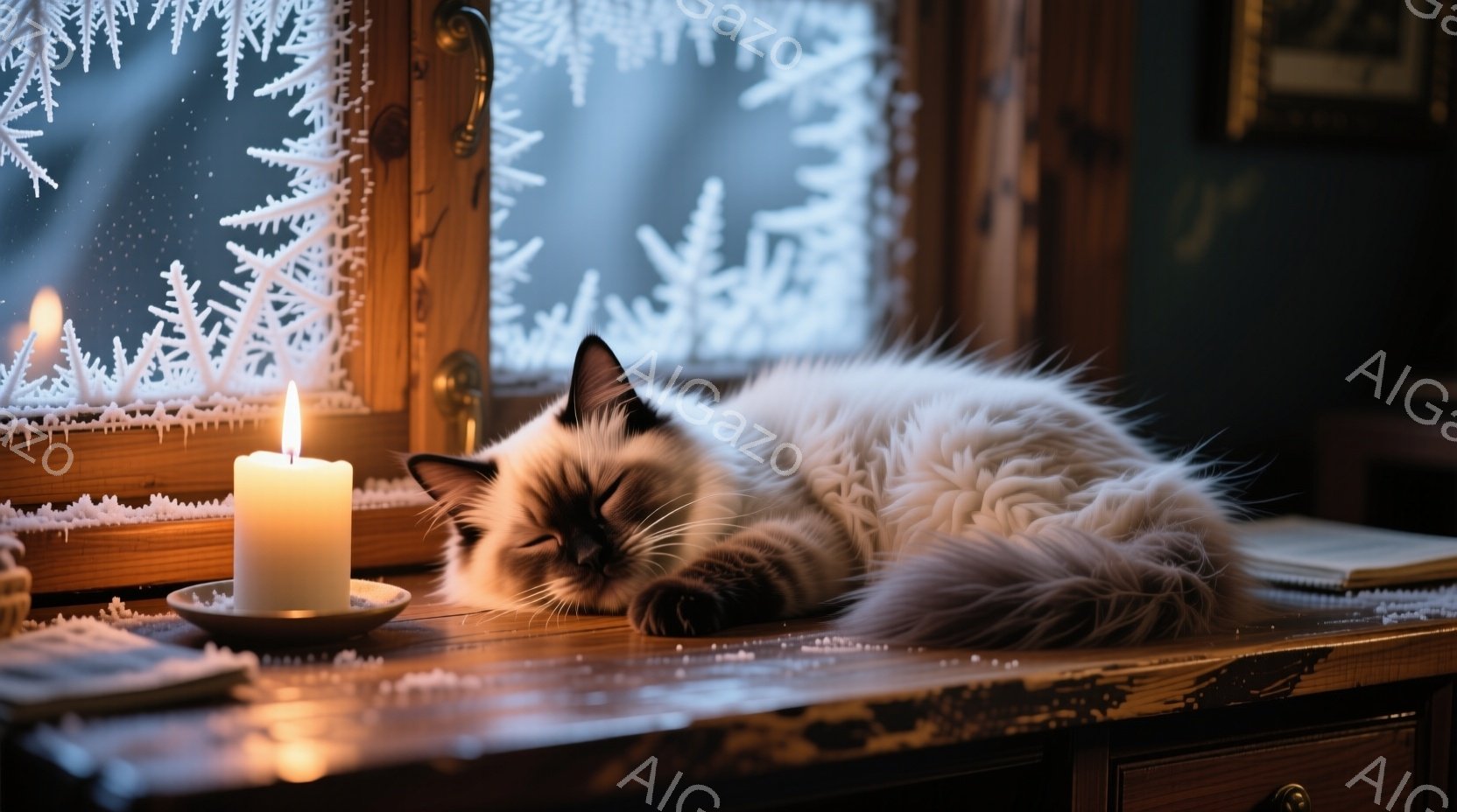 白い毛並みの猫が窓辺の棚で丸まって眠っている。窓ガラスには雪の結晶が描かれており、外は雪が降っているようだ。暖かく、穏やかな冬の日の雰囲気が漂い、近くには本と明かりが置かれている。
