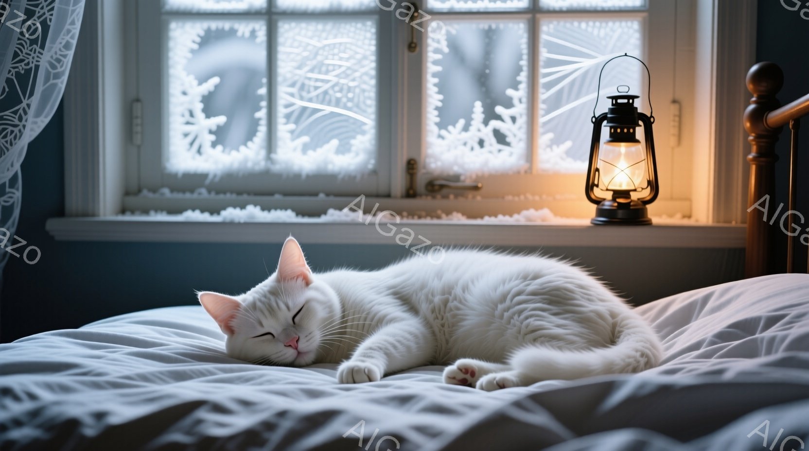 白い猫が白いベッドの上で丸まって眠っている。窓には霜が降りており、その上に複雑な模様が描かれている。ベッドの脇には灯りがともったランタンが置かれ、暖かく穏やかな雰囲気を醸し出している。