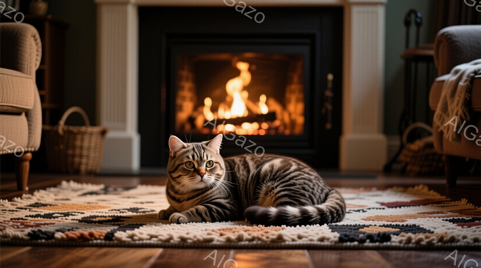 縞模様の猫が、色とりどりの幾何学模様のラグの上に丸まって座っています。暖炉が背景にあり、炎が暖かく光を放ち、居間には落ち着いた雰囲気が漂っています。籐製のバスケットに薪が入れられており、植物が暖炉の横に置かれ、快適な空間を演出しています。