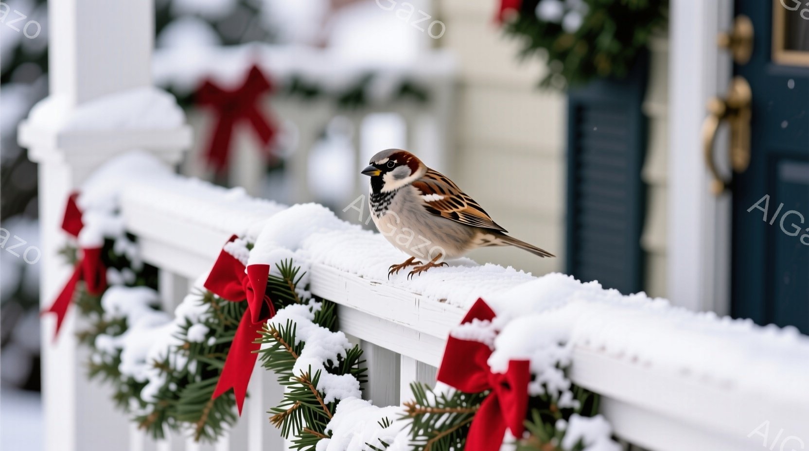 白い手すりに、茶色と黒の美しい模様を持つスズメが一羽とまっています。手すりにはクリスマス装飾の飾り付けが施され、赤いリボンと緑の葉が雪で覆われています。背景には白い家が見え、雪が舞い降りる冬の穏やかな雰囲気が漂っています。