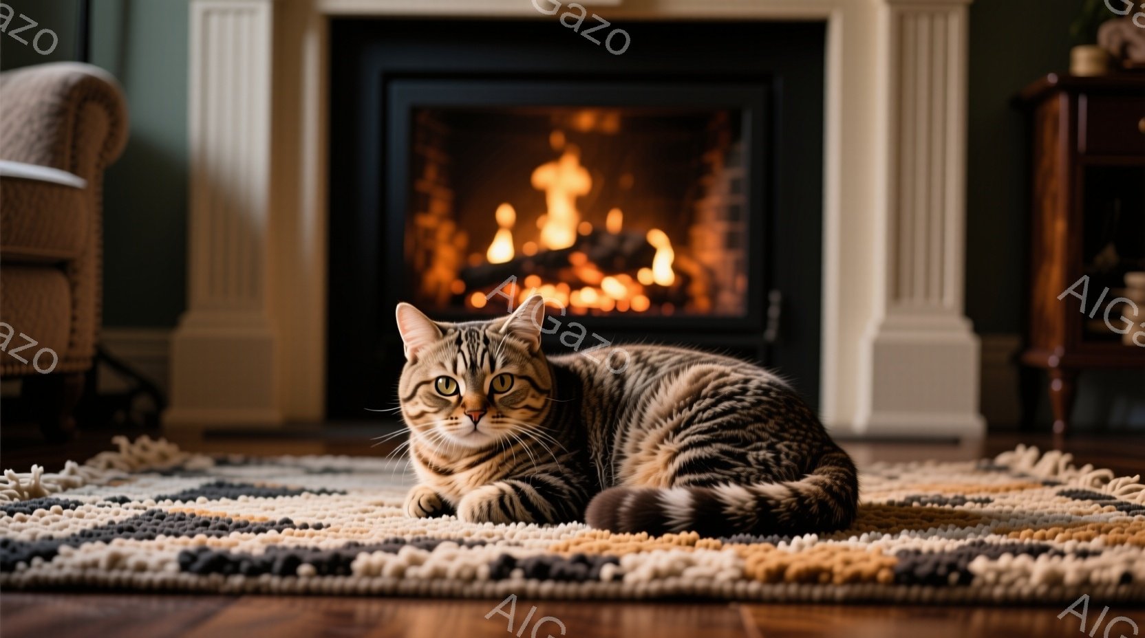 部屋の隅に薪が積み上げられ、その前に大きなトラが横たわっている。トラはリラックスした表情で、正面をじっと見つめており、毛並みは美しく、力強い印象を与える。暖炉の炎が暖かさを添え、木造の壁とペルシャ絨毯が、アットホームで落ち着いた雰囲気を醸し出している。