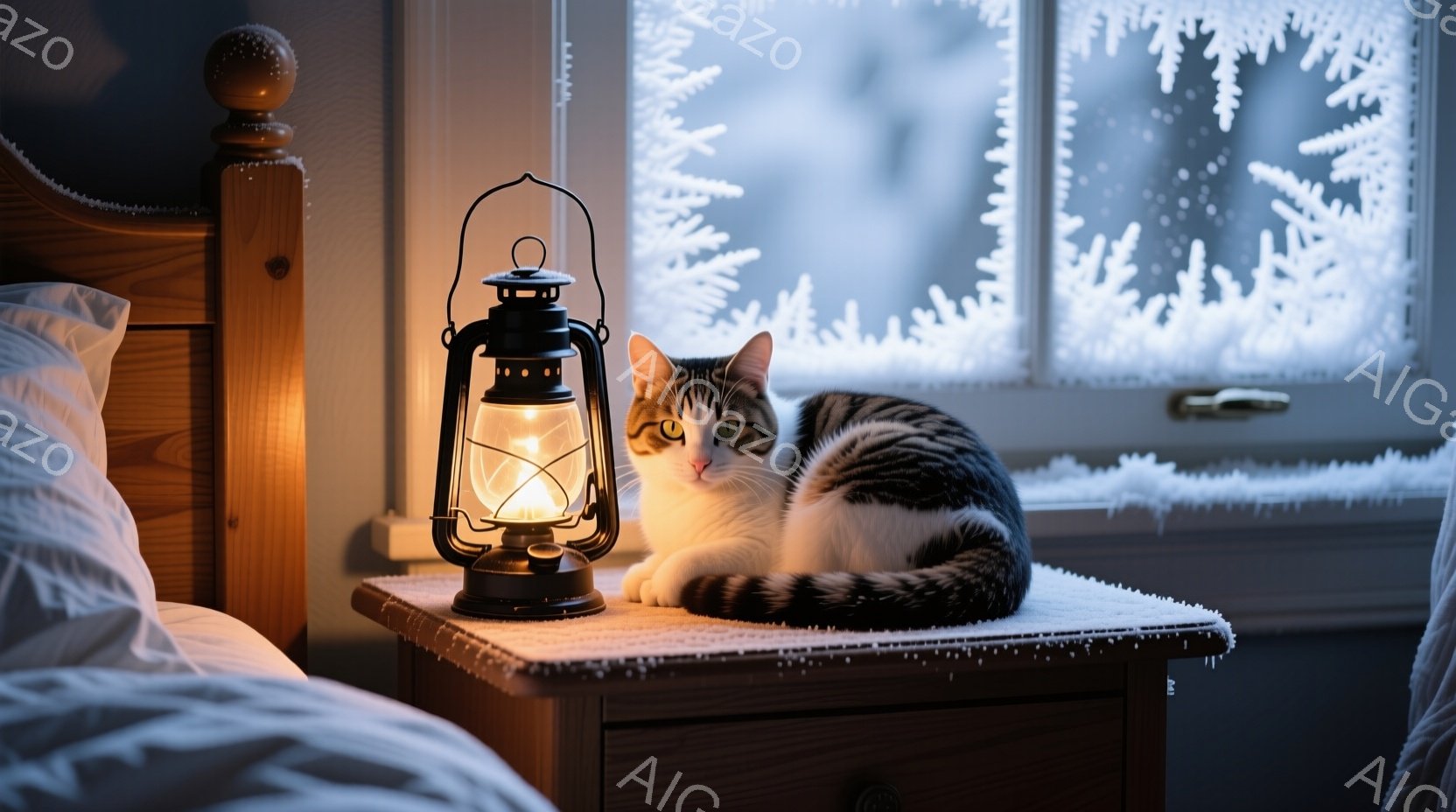 縞模様の猫が、ベッドサイドテーブルの上で丸まって休んでいます。テーブルの上には古いランタンが置かれ、暖かな光を放っています。窓は霜で覆われ、冬の静寂と暖かさの対比が、落ち着いた雰囲気を醸し出しています。