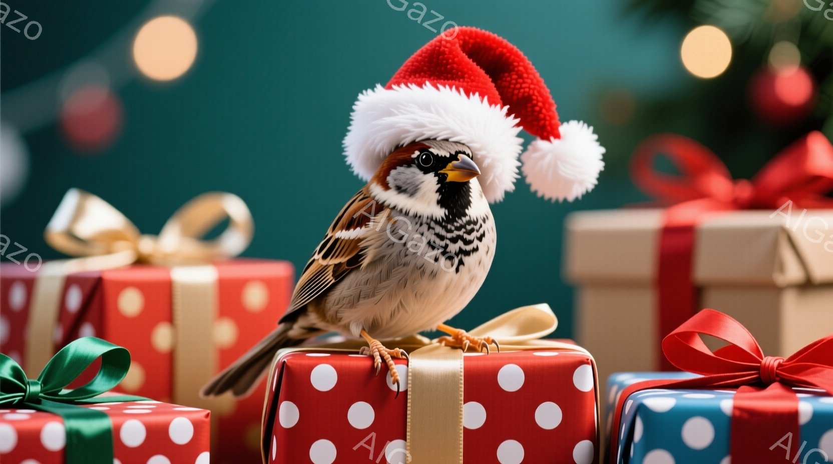 この無料AI生成画像「スズメがプレゼントボックスの上に立っており、頭には赤いサンタ帽をかぶっています。背景には赤と緑のドット柄のプレゼントボックスや金色のオーナメントが並び、クリスマスの雰囲気を醸し出しています。スズメは少し前かがみになり、どこかユーモラスで可愛らしい印象を与えます。」は、2025年10月22日に作成されました。 サイズは 1664×928px の高解像度で、商用利用も可能なフリー素材として提供しています。