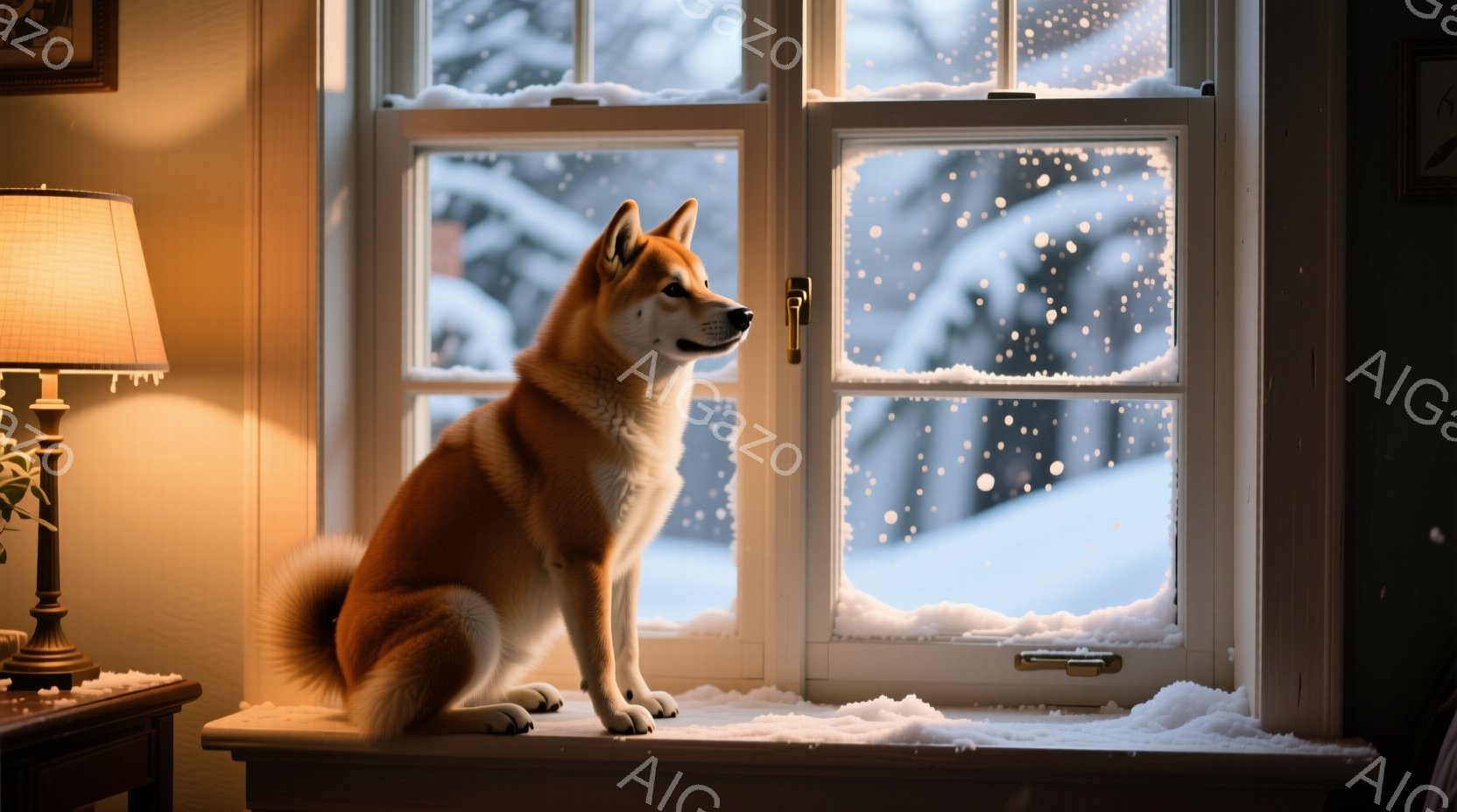 窓辺に柴犬が座っており、外は雪景色です。犬は落ち着いた表情で遠くを見つめており、暖かい室内とのコントラストが印象的です。背景には雪に覆われた木々が見え、静かで穏やかな冬の雰囲気が漂っています。