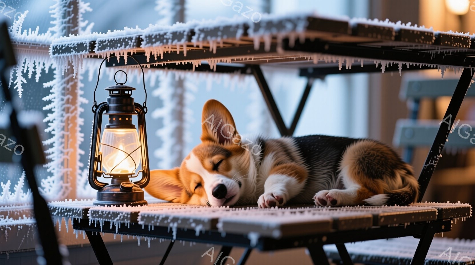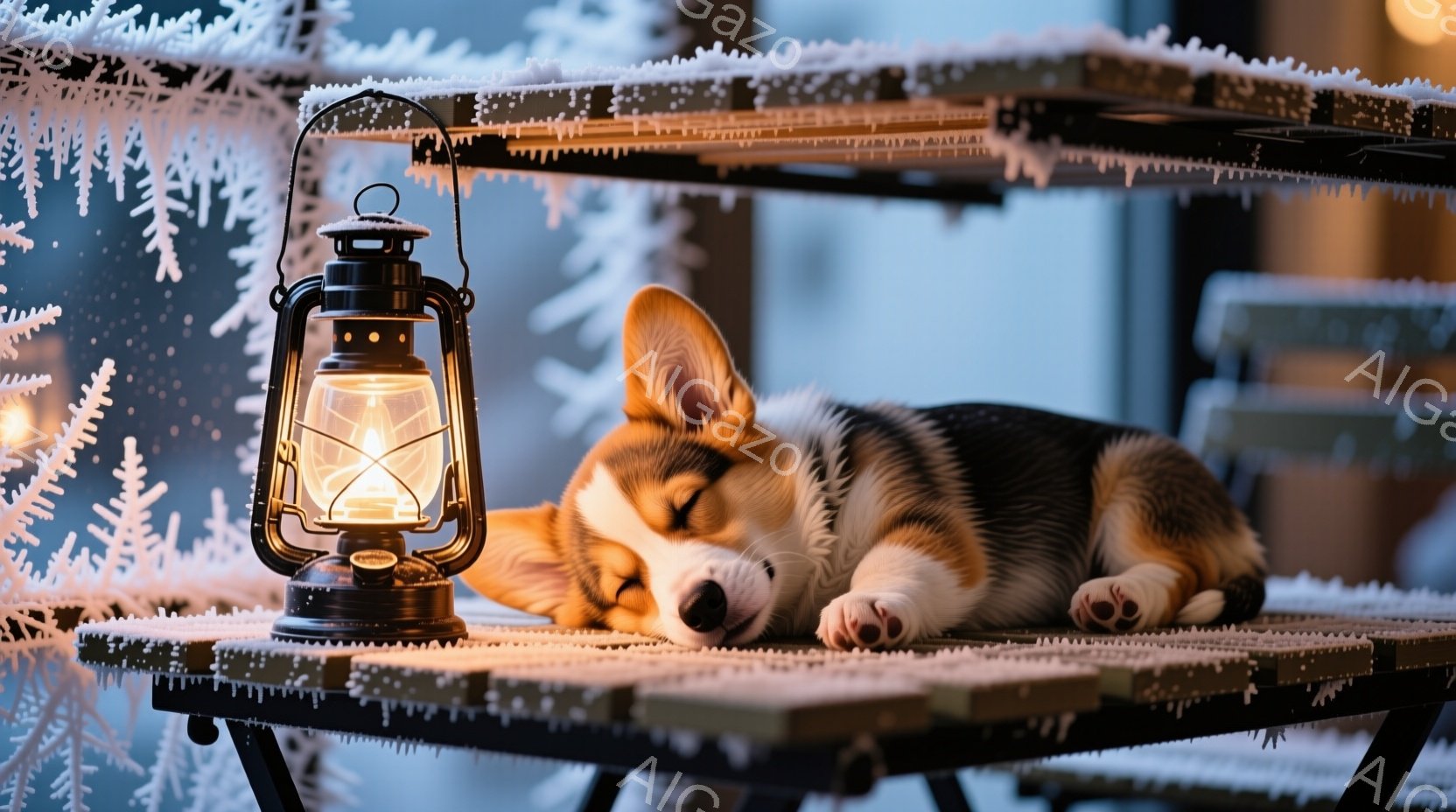 雪が降り積もった窓辺の折り畳みテーブルの上で、コルギの犬が丸まって眠っている。テーブルの上には、暖かく光るオイルランプが置かれ、犬を優しく照らしている。外は雪景色で、静かで穏やかな冬の日の雰囲気が漂っている。