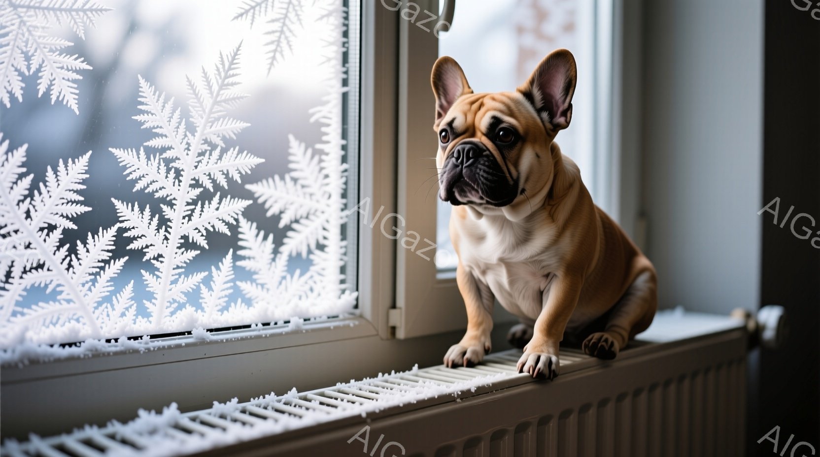 クリーム色の毛並みのフレンチブルドッグが、窓の外を物憂げに見つめている。窓には雪の模様のステッカーが貼られており、背後には白い暖房器具が並んでいる。穏やかで少し寂しげな冬の日の雰囲気が漂う。