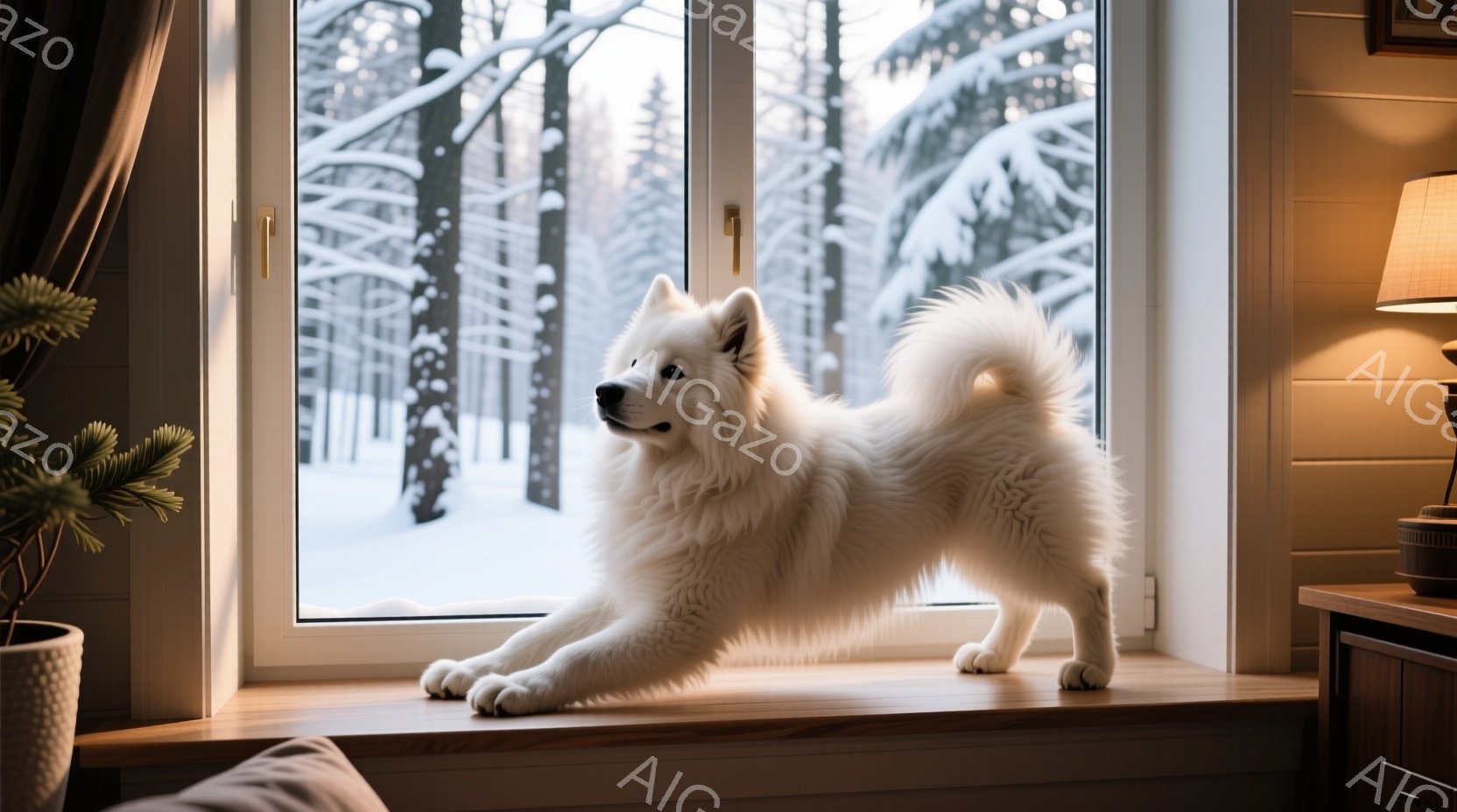白い牧羊犬が窓枠に前足をかけて立ち、外を見つめている。背景には雪に覆われた森が広がり、窓の外は冬の景色が広がっている。室内は木の壁で囲まれ、暖かく穏やかな雰囲気が漂っている。