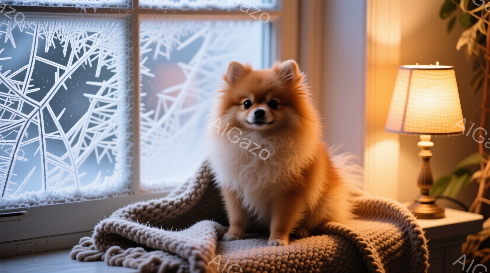 窓辺にふわふわのクリーム色のブランケットが敷かれ、その上にオレンジ色の毛並みの美しいポメラニアンが座っています。窓ガラスには霜が降りており、室内は暖かく穏やかな雰囲気です。犬は前足を揃え、まっすぐ前を見つめており、どこか物憂げで可愛らしい表情をしています。