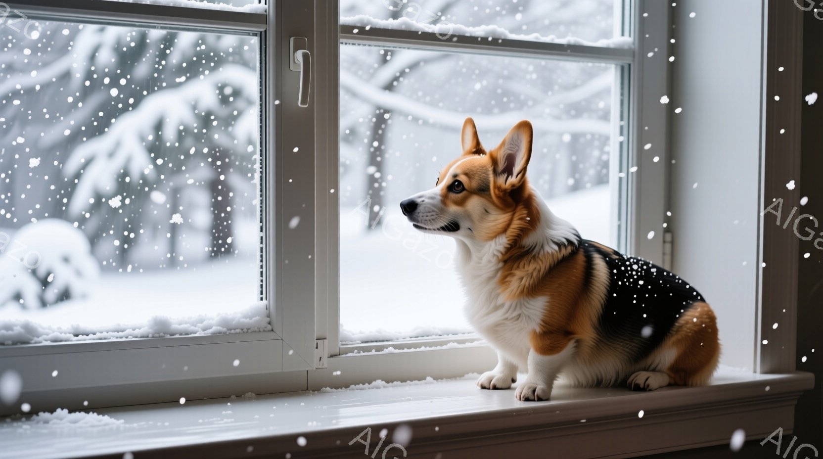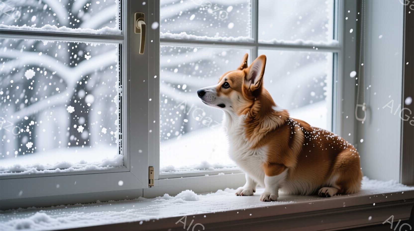 白い窓辺に、茶色と黒のコルギ犬が座り、外を眺めている。雪が降り積もり、窓の外にはうっすらと木々が見える冬の風景が広がっている。犬は少し憂いを帯びた表情で、穏やかながらもどこか寂しげな雰囲気を醸し出している。