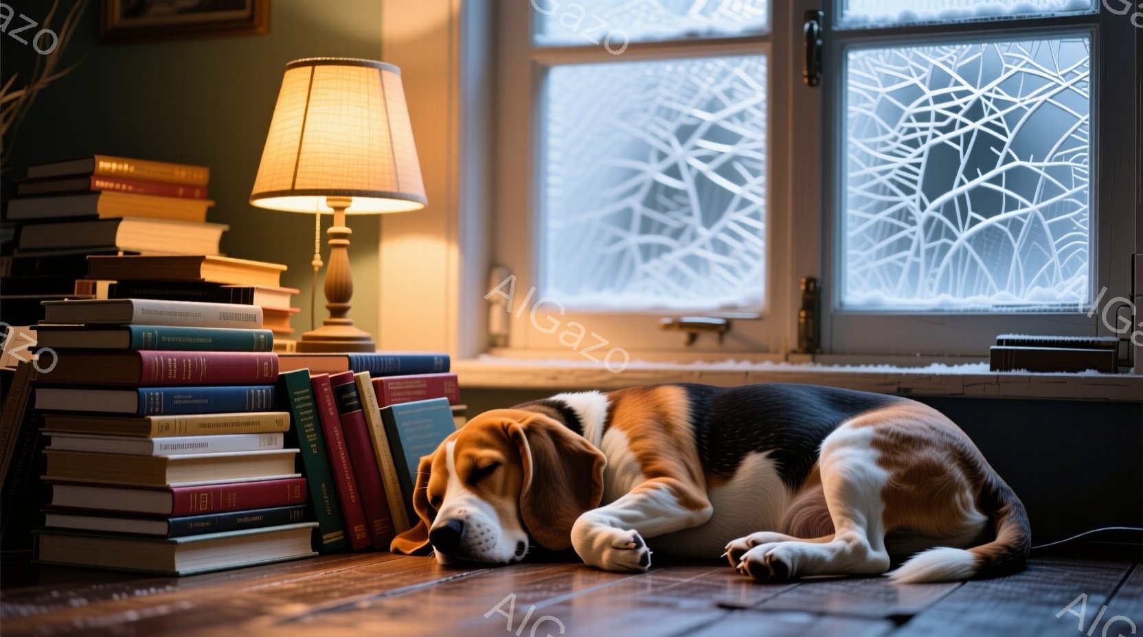 温かい光に照らされた室内で、ビーグル犬が床に横たわって眠っています。積み重ねられた本の山と、レースのカーテン越しに見える外の景色が背景にあり、落ち着いた雰囲気を醸し出しています。犬はリラックスした姿勢で、静かで穏やかな時間が流れていることを感じさせます。