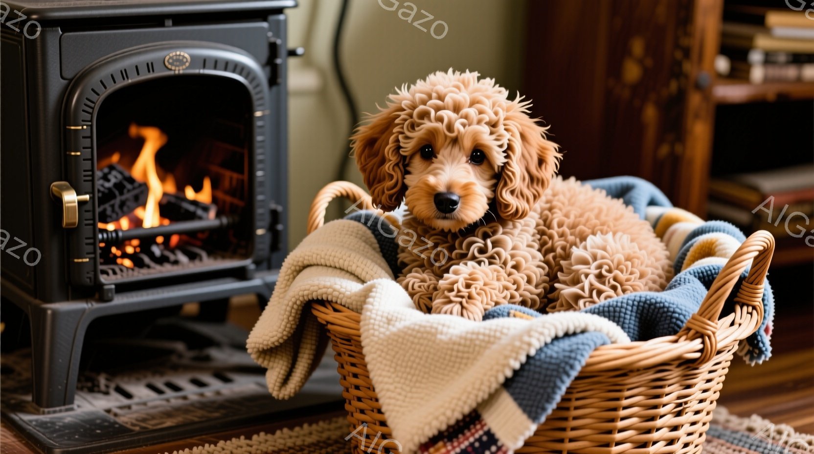 柔らかい毛並みのクリーム色のトイプードルが、編み物のブランケットに包まれた籐のバスケットの中で丸まって眠っています。背景には、暖炉から炎が立ち上り、部屋全体を温かい光で満たしています。この画像は、リラックスした、居心地の良い雰囲気で、冬の暖炉の傍での休息を表しています。
