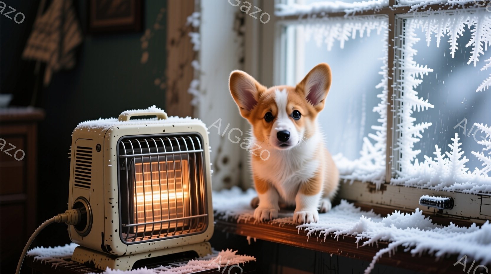 窓辺に雪の結晶模様が描かれた背景を背に、コーギーの子犬が暖房器具の上に乗ってこちらを見ている。子犬は茶色と白の毛並みで、少し警戒したような、好奇心旺盛な表情をしている。室内は暖かく、穏やかな冬の日の雰囲気が漂っている。