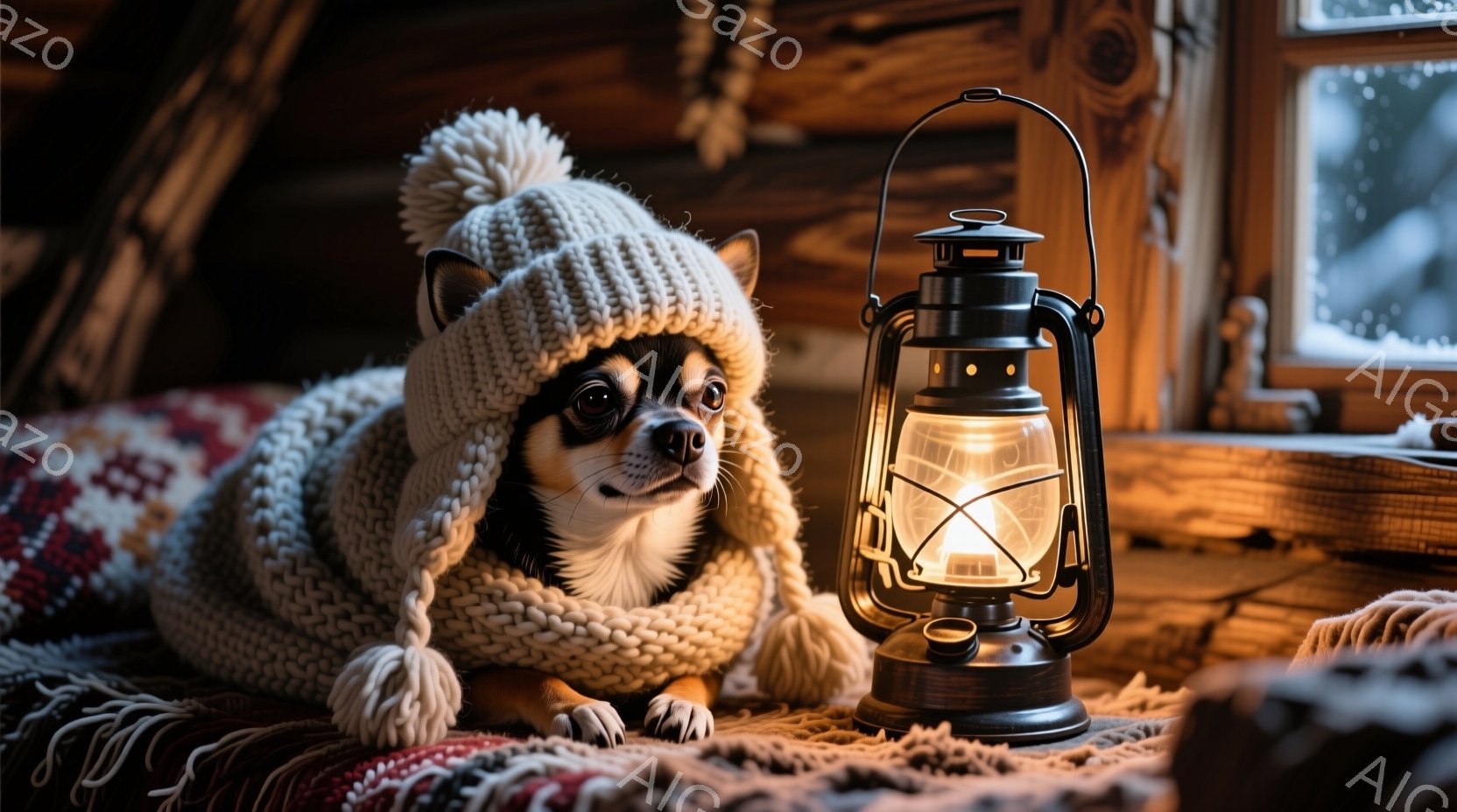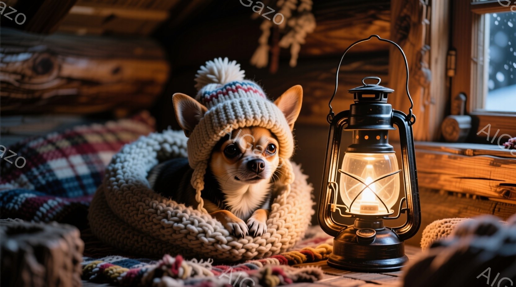 小さなチワワが、編み物の帽子とマフラーを身に着けて、赤いチェック柄のブランケットの上に横たわっています。その表情はどこか物憂げで、遠くを見つめています。背景には、木製の壁と窓の外の雪景色が見え、暖かく居心地の良い冬の雰囲気が漂っています。