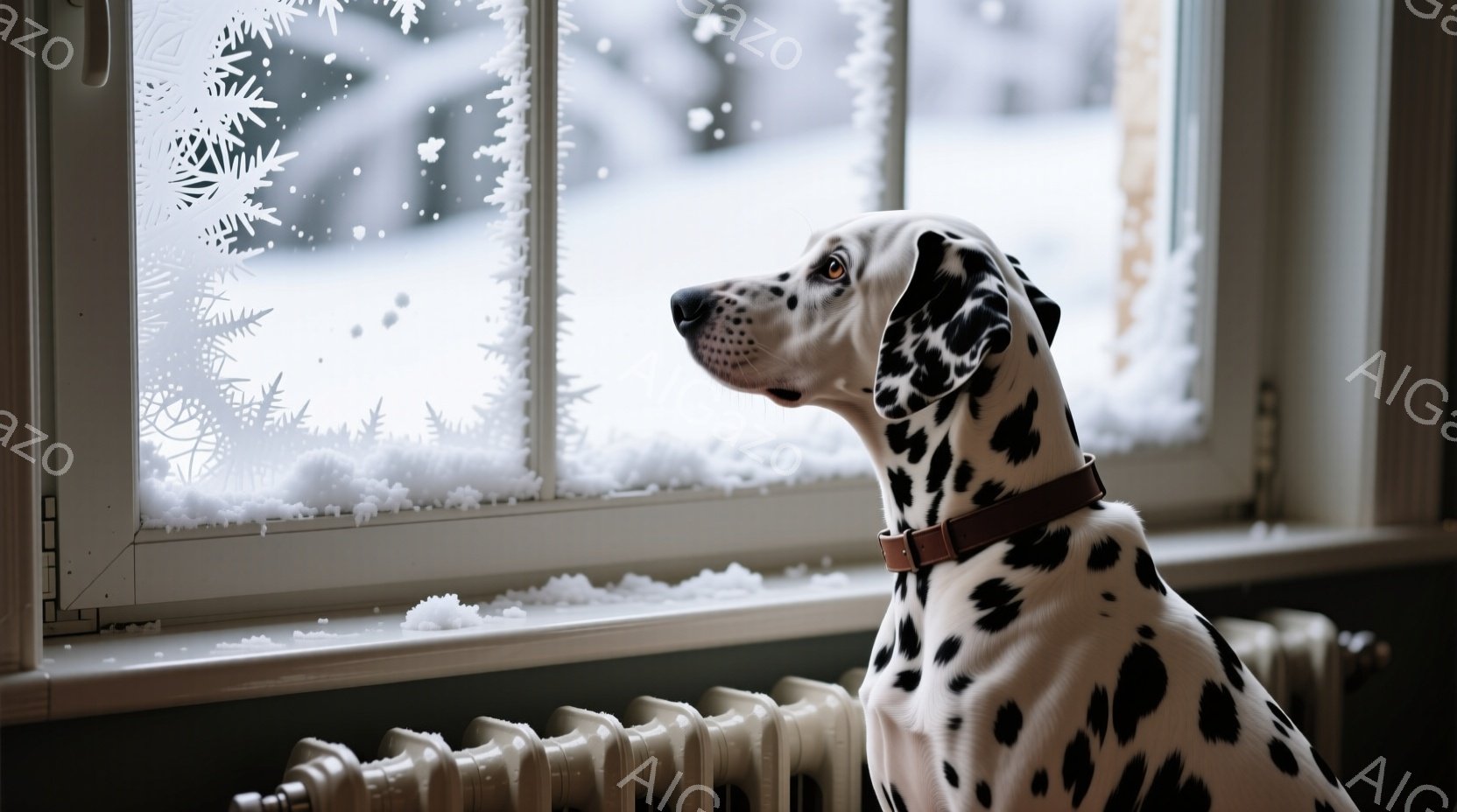 白地に黒い斑点模様のダルメシアンが、窓の外の雪景色をじっと見つめている。窓枠には霜が降り積もり、暖房器具のラジエーターも雪で覆われていることから、外は厳しい冬の寒さであることがわかる。暖かく落ち着いた室内とのコントラストが、静かで穏やかな雰囲気を醸し出している。