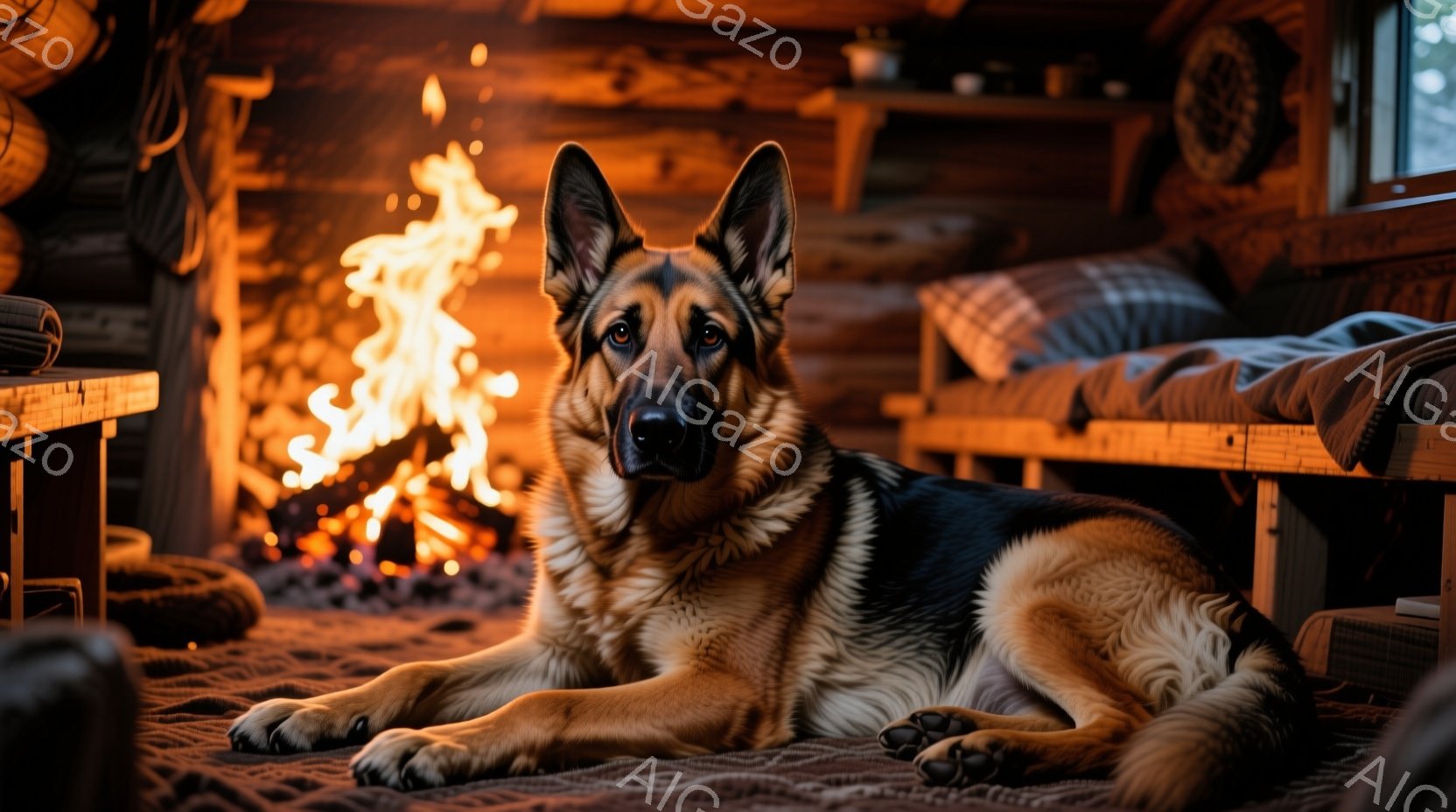 暖炉の前で横たわるジャーマンシェパードが写っています。毛並みは美しく、落ち着いた表情で正面を見ています。背景には木の壁と棚、そして暖炉の炎が映り込み、温かくリラックスした雰囲気が漂っています。