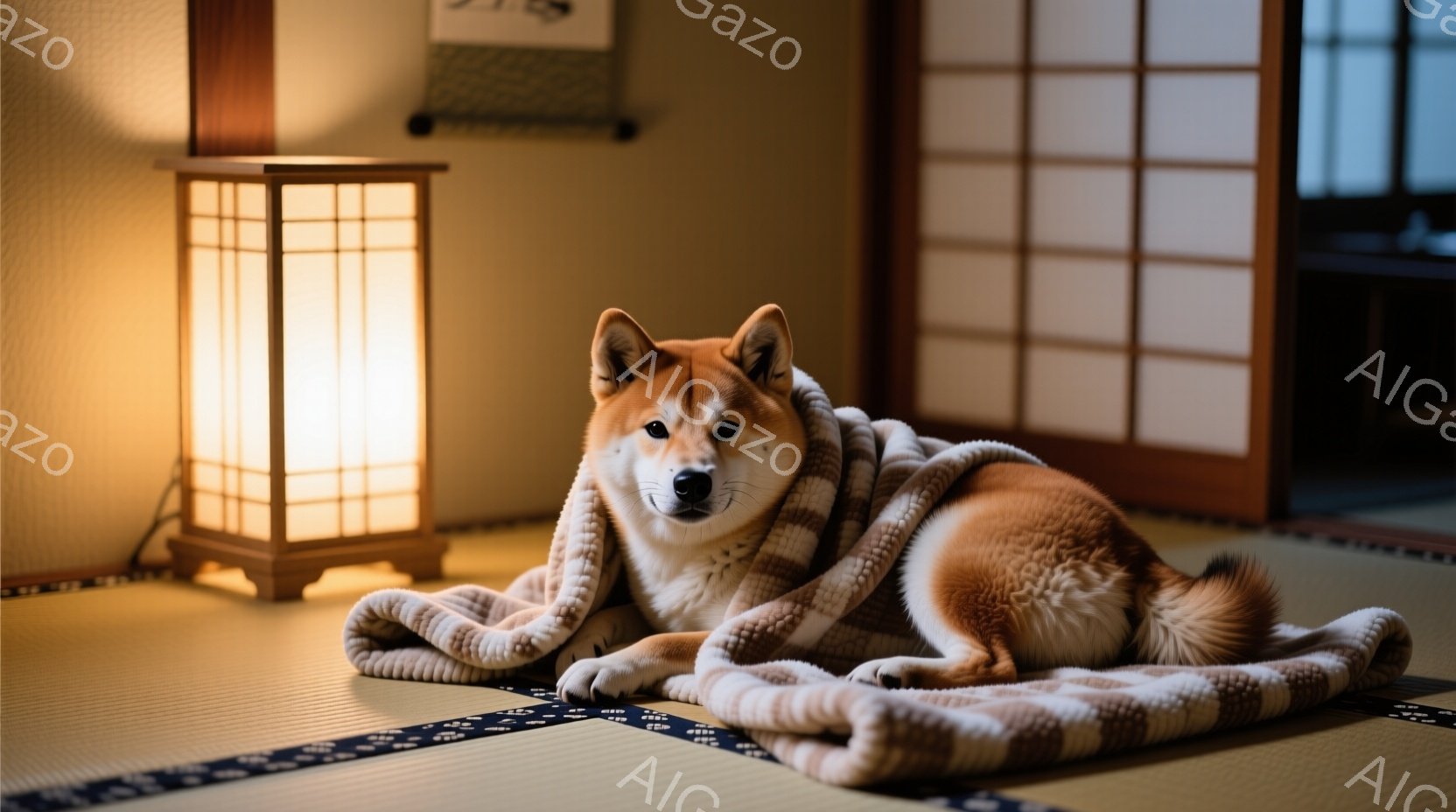 畳の上に柴犬が毛布にくるまって横たわっています。温かい光を放つ提灯が犬のそばに置かれており、部屋全体が落ち着いた雰囲気に包まれています。障子戸と薄暗い室内は、日本の伝統的な空間を思わせ、リラックスした穏やかな時間が流れているようです。