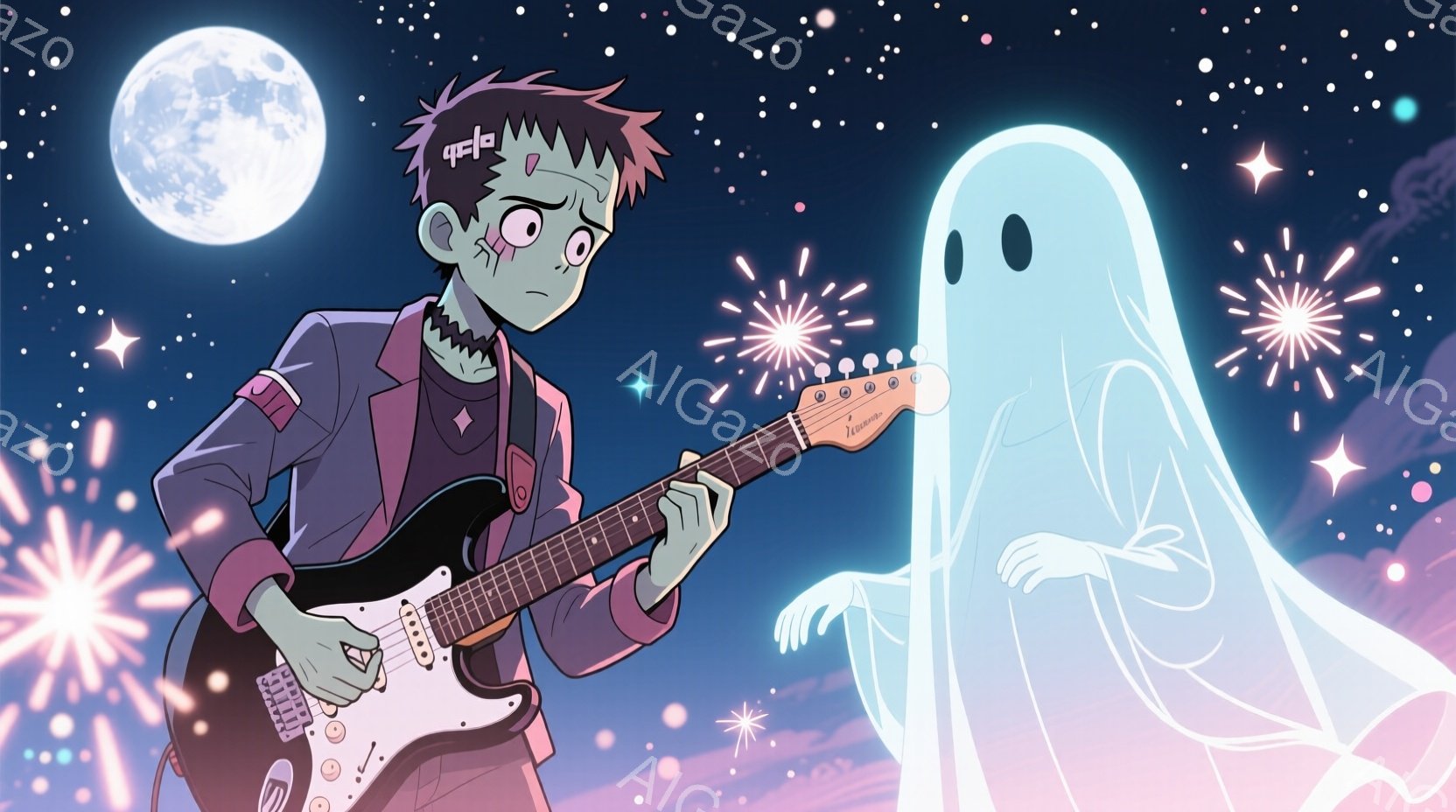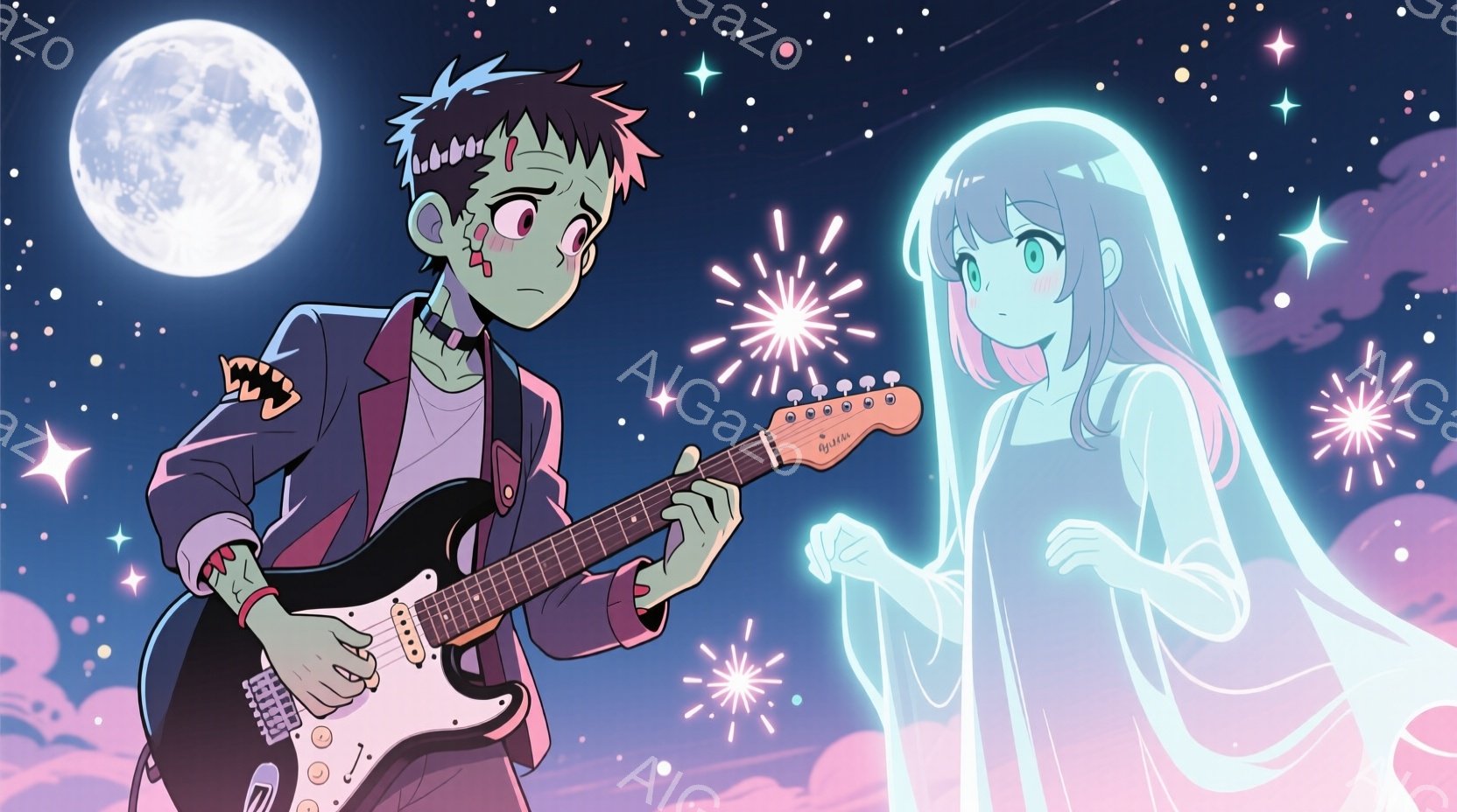 フランケンシュタイン風の少年が電気ギターを弾いており、少し微笑んでいます。彼の髪型は特徴的な緑色で、服装はダークなトーンのシャツとジャケットです。背景には紫色の雲と輝く星、そして満月が描かれており、少し離れた場所に青い髪の幽霊のような少女が浮かんでいます。