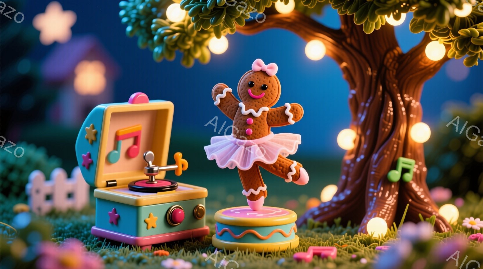 ジンジャーブレッドクッキーで作られたバレリーナが、ターコイズブルーの台の上に立って踊っています。背景には、カラフルな音楽プレーヤーや積み木が置かれ、緑の芝生の上に可愛らしい家が並んでいます。夜空には音楽記号が浮かび、全体的に夢のような、おとぎ話のような雰囲気が漂っています。