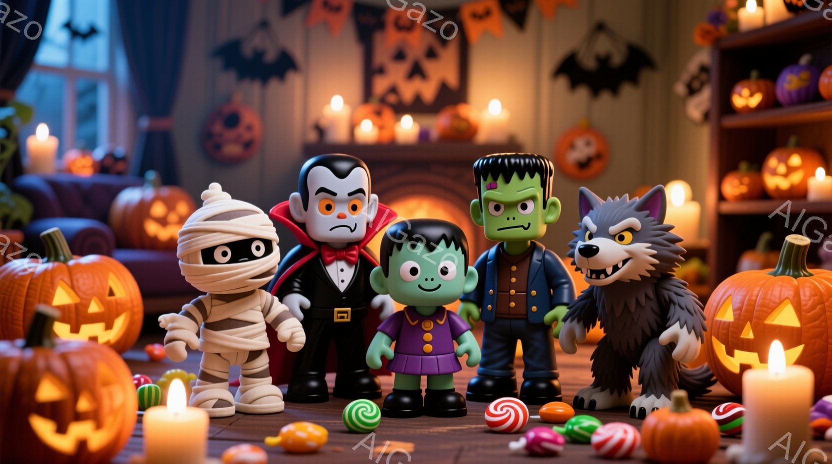 ハロウィーンの装飾が施された部屋の中に、ミイラ、ドラキュラ、フランケンシュタイン、狼男の小さな人形たちが並んでいます。彼らはそれぞれハロウィーンらしい衣装を身につけ、明るい表情で楽しんでいるようです。背景にはジャック・オ・ランタンやキャンディーが置かれ、暖かくお祝いムードに満ちた雰囲気です。