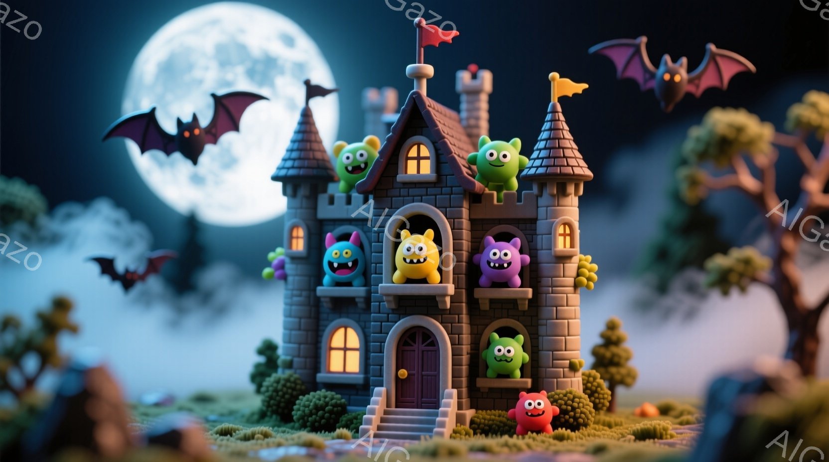 灰色の石造りの城が、緑の芝生の上に可愛らしく建っており、様々な色のモンスターたちが窓から顔を出しています。背景には満月が輝き、黒いコウモリが飛び交い、ハロウィーンの夜を思わせる雰囲気です。全体的に明るい色使いで、可愛らしく、少し不気味な、楽しい夜の情景が表現されています。