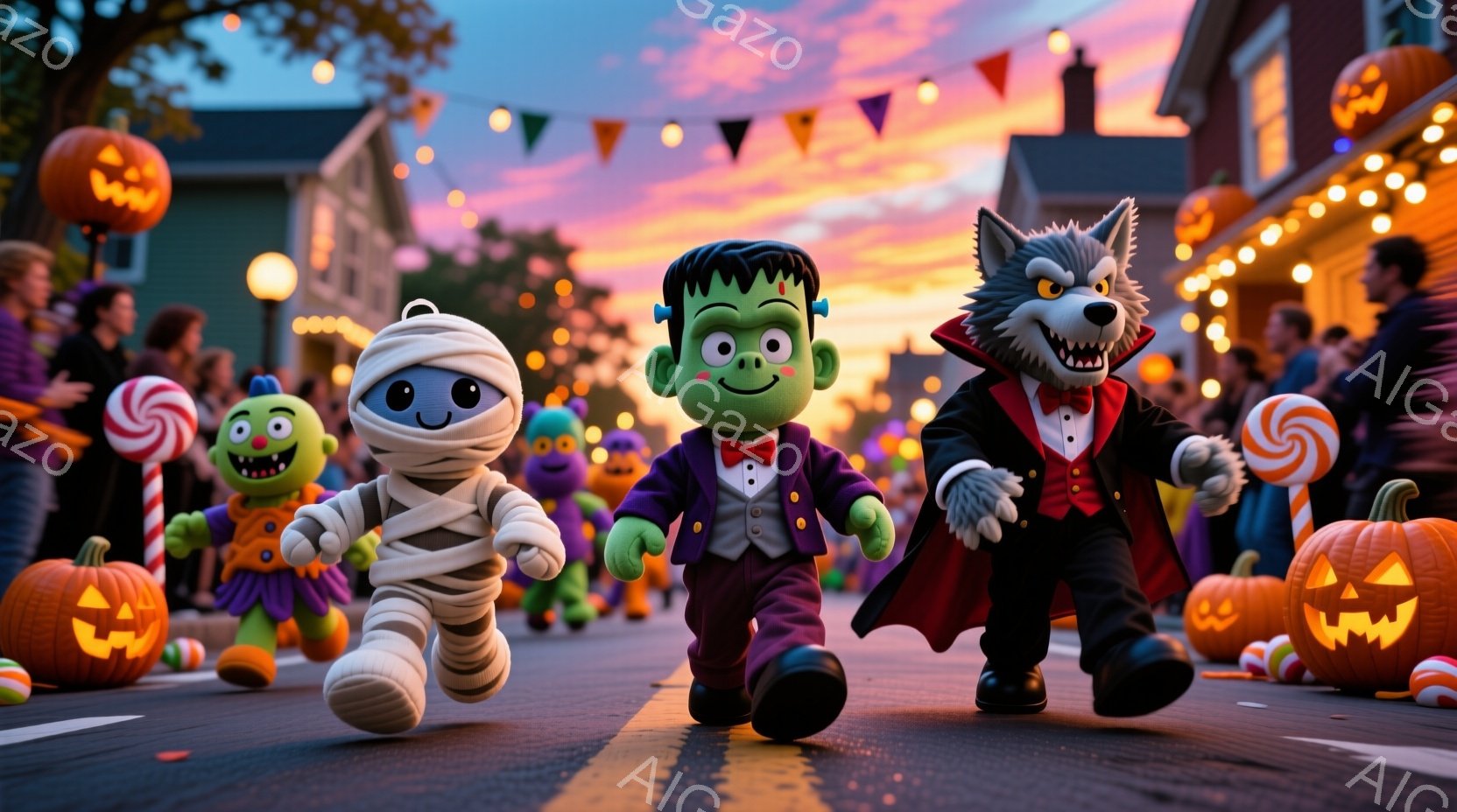 ハロウィーンの夜、お化け、ミイラ、フランケンシュタイン、狼男の姿をした子供たちが、街の路上を走っている。背景には、カボチャのランタンが並び、家々には飾り付けが施され、夕焼け空がハロウィーンの雰囲気を盛り上げている。全体的に明るく陽気で、お祭りの活気を感じさせる。