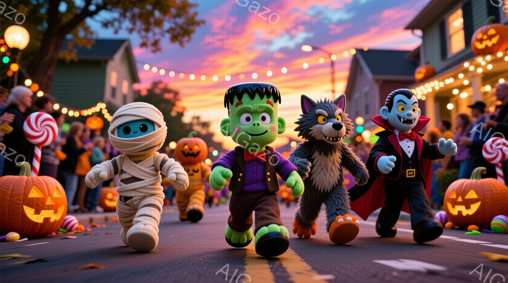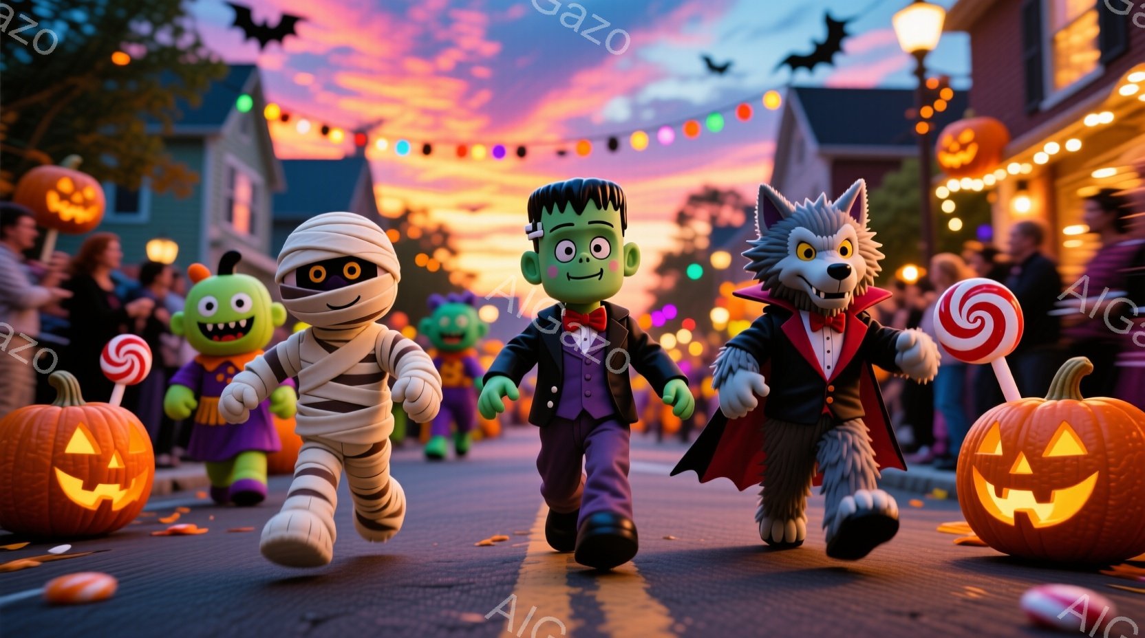 ハロウィーンの夜に、ミイラ、フランケンシュタイン、狼男のキャラクターたちが楽しそうに歩いている様子が描かれています。背景には、かぼちゃのランタンやキャンディーで飾られた通りと、夕焼け空が広がっており、ハロウィーンの賑やかで楽しい雰囲気が伝わってきます。キャラクターたちはそれぞれ個性的な衣装を着ており、特にフランケンシュタインは緑色の肌とボルト、狼男は黒いスーツに赤いバウタイが印象的です。