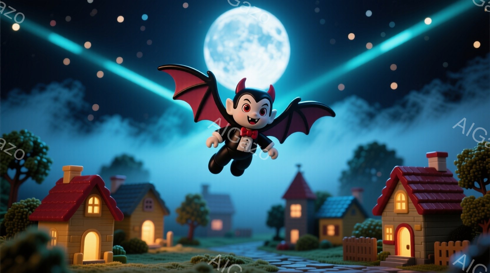 小さな悪魔のような少年が、黒い翼を広げて空中に浮遊しています。赤いシャツに黒いズボンを身につけ、首には蝶ネクタイを締めています。背景には、ハロウィーンらしい可愛らしい家々が並び、月明かりと霧が幻想的な雰囲気を醸し出しています。