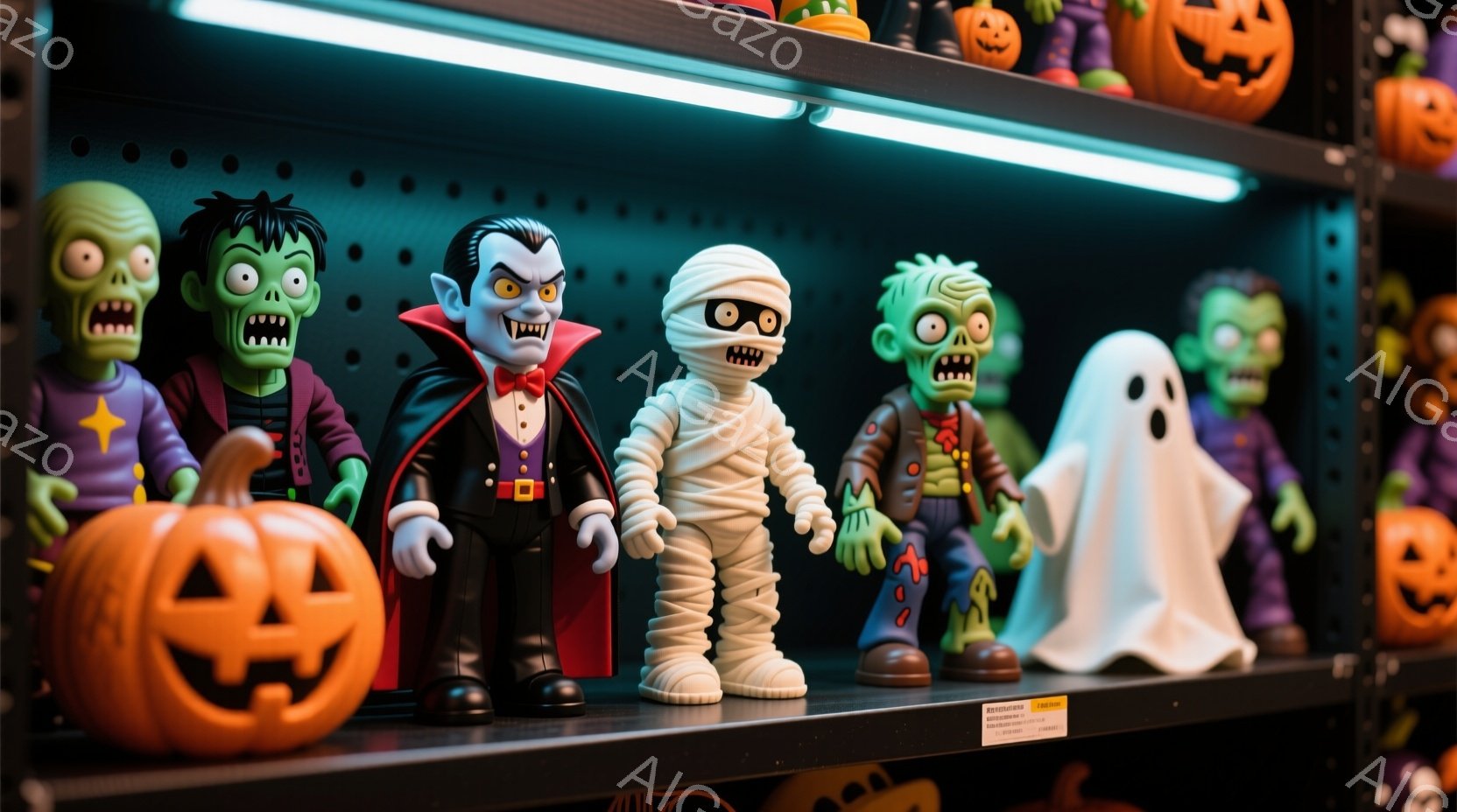 ハロウィーンの夜に、フランクensteinのモンスターとミイラのキャラクターが並んで立っています。どちらも大きな頭と小さな体をしており、それぞれオレンジ色のカボチャの模様が入ったバッグを持っています。背景には、オレンジ色の光を放つカボチャのランタンが散りばめられた住宅街が広がっており、夕暮れ時の暖かい雰囲気を作り出しています。
