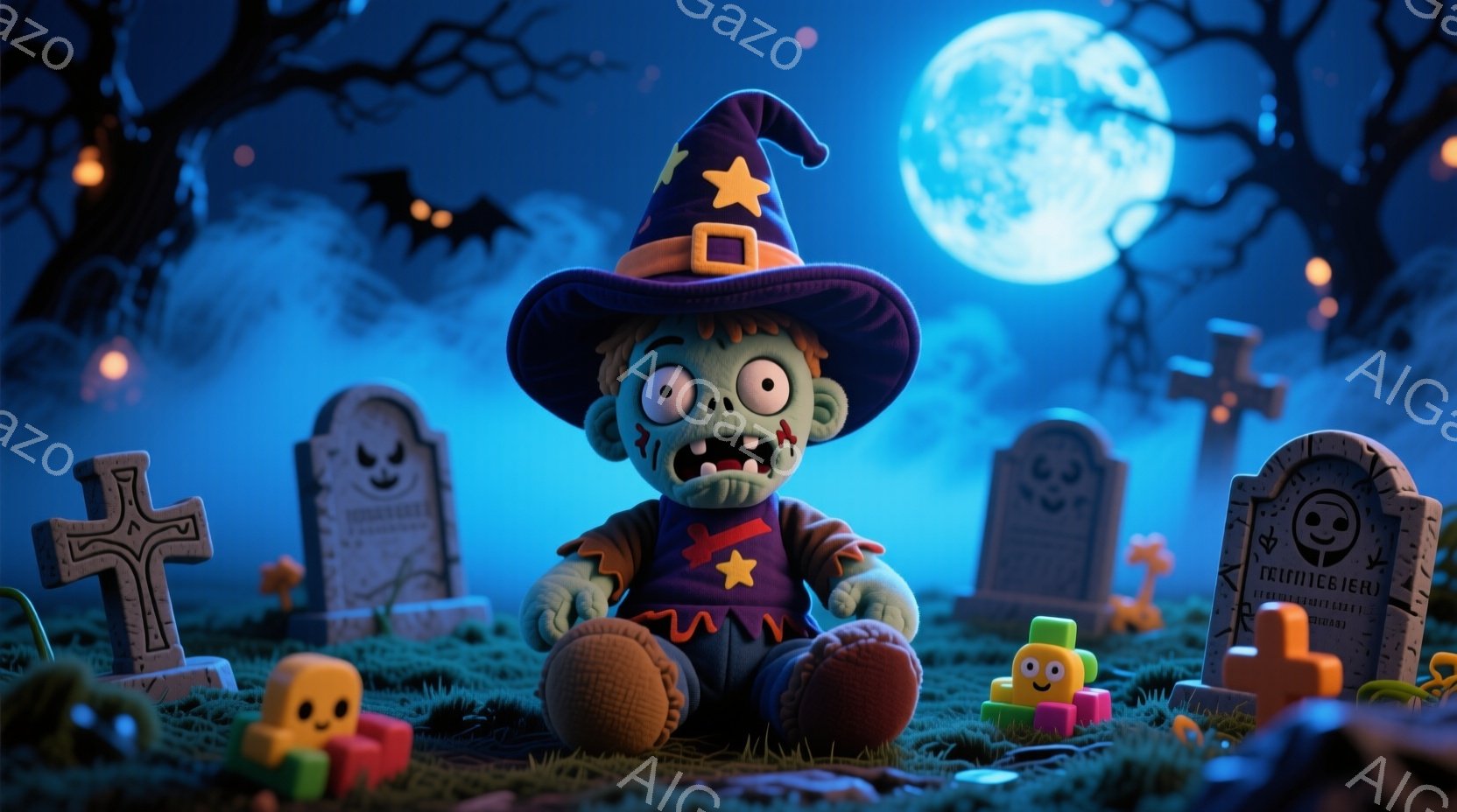 ゾンビ風の可愛い人形が、ハロウィーンの墓地のセットの中に座っています。紫色の帽子とオレンジ色のトップス、そして紫色のズボンというハロウィーンらしい衣装を着ており、表情は少し間抜けで可愛らしいです。背景には青い月、墓石、不気味な木々、そしてオレンジ色の小さなカボチャやキャンドルが散りばめられ、ハロウィーンの夜の雰囲気を醸し出しています。