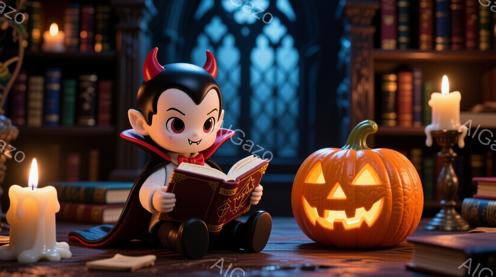 小さな吸血鬼のような少年が、古びた本を熱心に読んでいる様子が描かれています。彼は黒いスーツに赤いマントを羽織り、整った黒髪と鋭い牙が特徴的で、真剣な表情で本に集中しています。背景には、たくさんの古書が並んだ書架と、ハロウィンカボチャとロウソクが置かれており、全体的にミステリアスで幻想的な雰囲気を醸し出しています。
