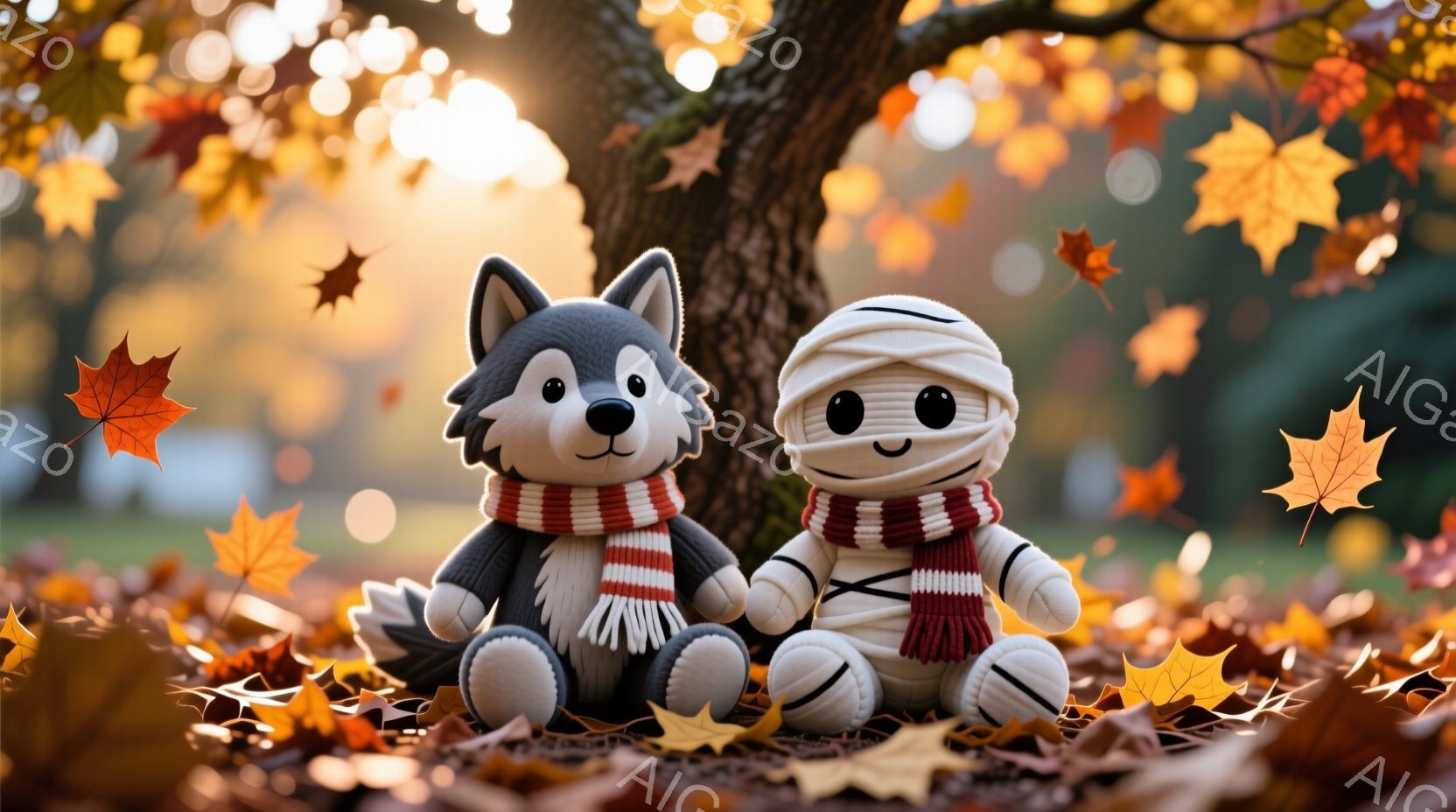 灰色の狼のぬいぐるみとミイラのようなぬいぐるみが、落ち葉がたくさんある地面に並んで座っています。どちらもオレンジと白のストライプの首巻きを巻いており、狼は微笑んでいて、ミイラは穏やかな表情をしています。背景には木々があり、空は明るく、全体的に秋の暖かく穏やかな雰囲気が漂っています。