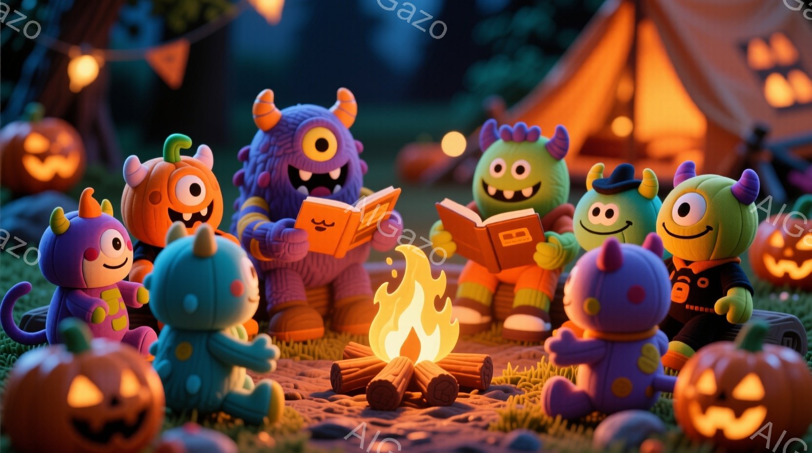 ハロウィーンをテーマにした、カラフルなモンスターたちがキャンプファイヤーを囲んでいるイラストです。紫、緑、オレンジ、ピンクなどの様々な色のモンスターたちは、本を読んだり、リラックスしたりして楽しんでいます。背景には、ハロウィーンカボチャやテント、緑豊かな草地が広がり、秋の夜の温かく楽しい雰囲気を醸し出しています。