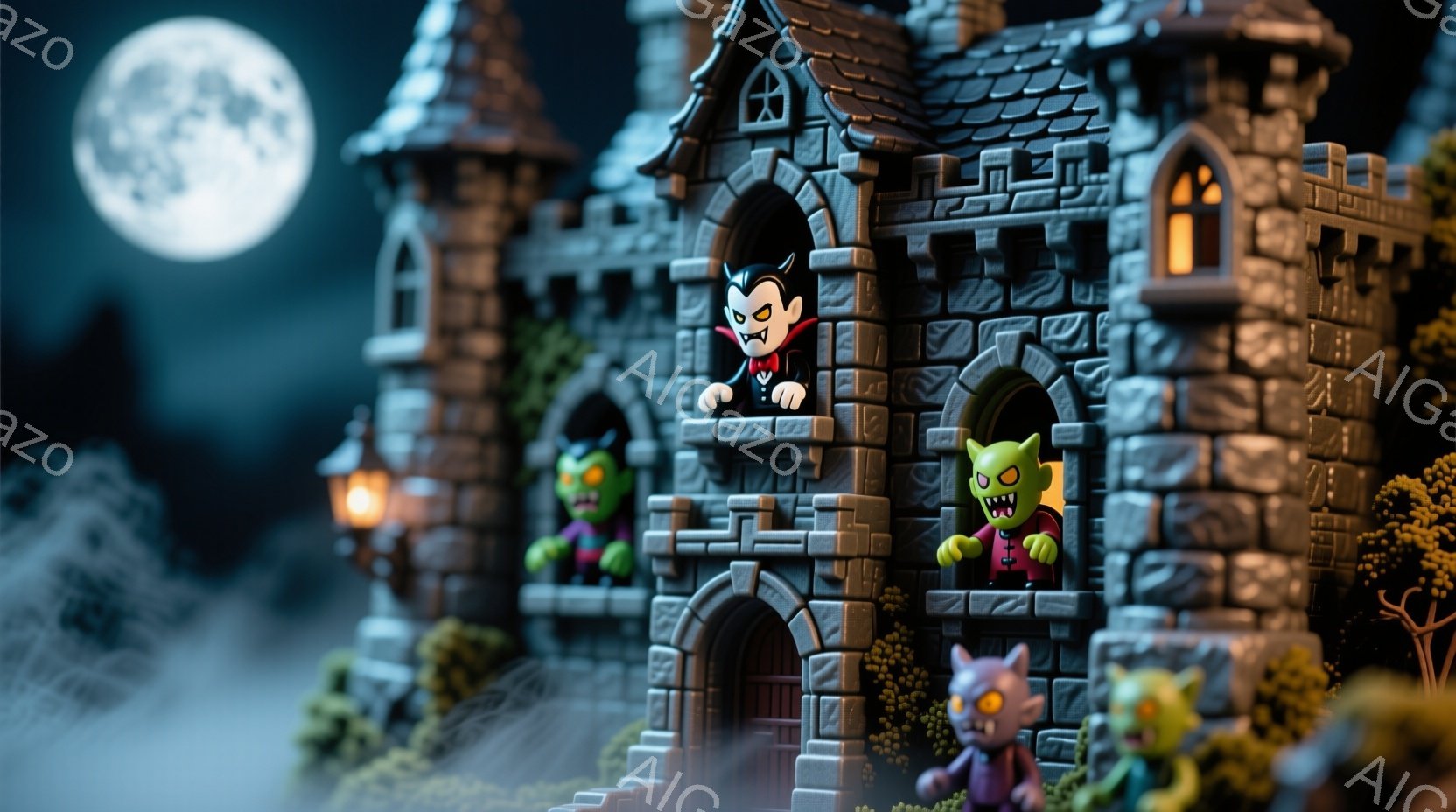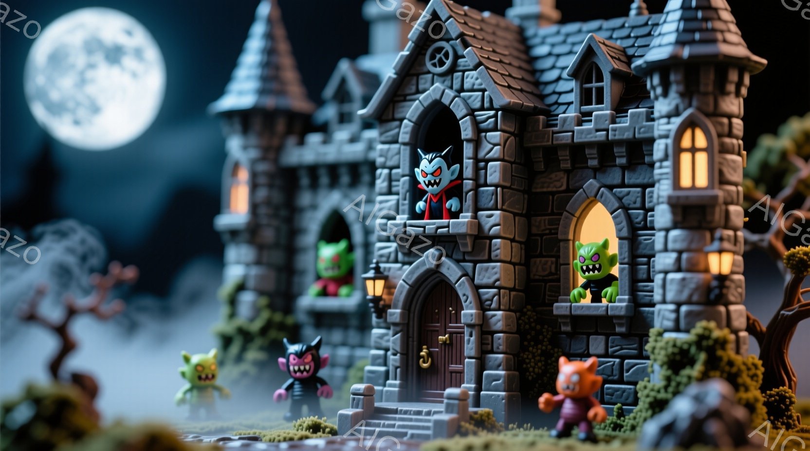灰色の石造りの城が、満月の夜に浮かび上がっています。様々な色のモンスターたちが城の周りや窓から顔を出し、少しおどけた表情をしています。背景には薄い霧が立ち込め、不気味ながらもどこか可愛らしい雰囲気を醸し出しています。