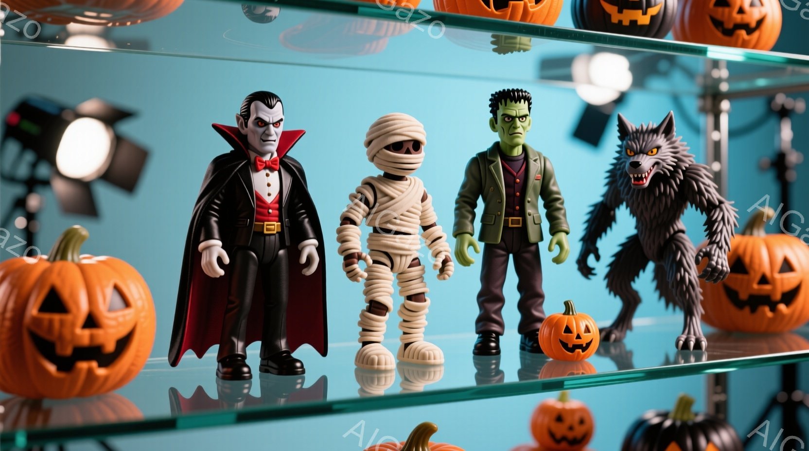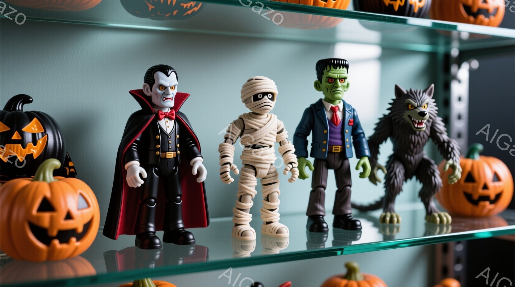ハロウィーンの装飾が施された棚の上に、ドラキュラ、ミイラ、フランケンシュタイン、狼男のフィギュアが並んでいる。それぞれのフィギュアは特徴的な衣装を着ており、ドラキュラは黒いスーツに赤いマント、フランケンシュタインは緑色の肌とボルト、ミイラは包帯で覆われている。オレンジ色のジャック・オ・ランタンがフィギュアの周囲を飾り、全体的に不気味でありながらも楽しいハロウィーンの雰囲気を醸し出している。