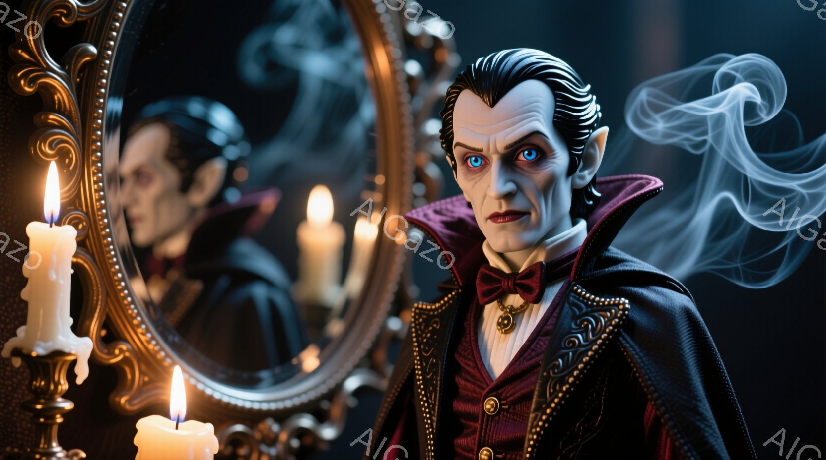 鮮やかな緑色の瞳を持つ男性が、赤い襟元のケープと黒いボウタイを身につけ、優雅にポーズをとっています。彼は鏡に向かっており、鏡には自身の姿が映し出されています。背景には燃えるキャンドルが灯り、ドラマチックな雰囲気を醸し出しています。