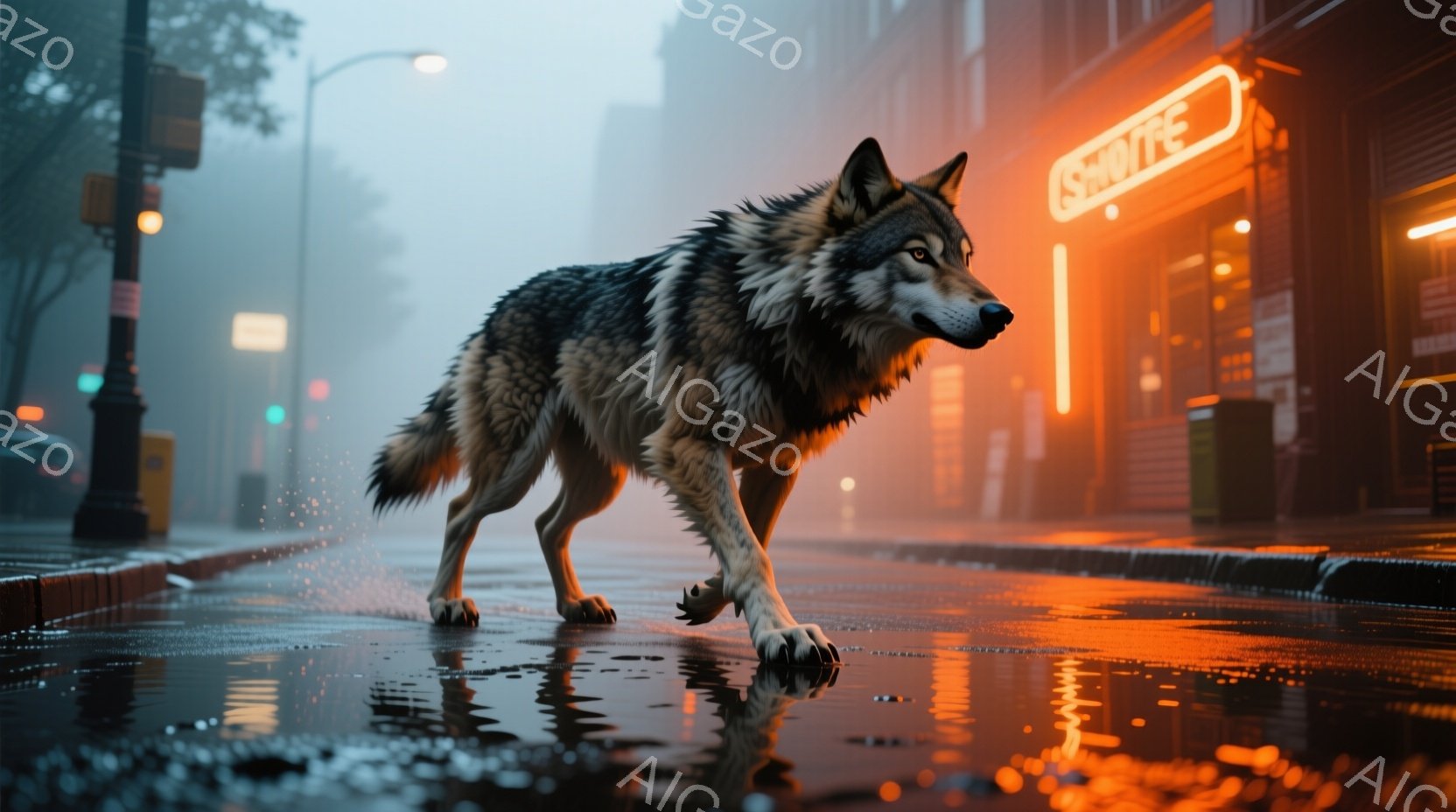 濡れた路面に一匹の狼が歩いている様子が描かれている。背景は霧がかった都市の風景で、オレンジ色のネオンライトが水面に反射し、幻想的な雰囲気を醸し出している。狼は力強く前進し、その姿は都会の喧騒の中に現れた野生の象徴のようだ。