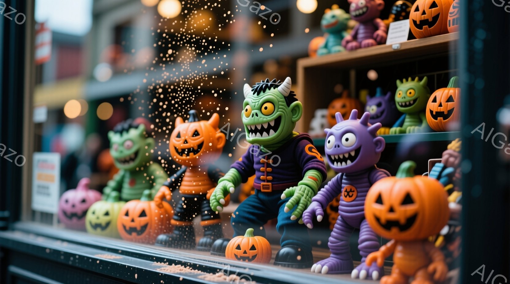 オレンジ色のハロウィーンの背景に、カラフルなモンスターとジャック・オー・ランタンのフィギュアが並んでいます。緑色のモンスターは、オレンジと紫色の衣装を着て、愉快な表情で前に手を伸ばしています。背景には、ぼやけた建物や他のフィギュアが見え、全体的に楽しげで季節感あふれる雰囲気です。