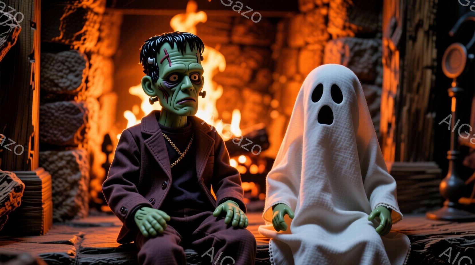 緑色の肌をしたフランケンシュタインのモンスターと、白い幽霊が暖炉の前で座っています。フランケンシュタインは暗いスーツを着ており、幽霊は白い布で覆われています。暖炉の炎が暖かく、背景には木製の壁と切り株が見え、お祝いの雰囲気を醸し出しています。