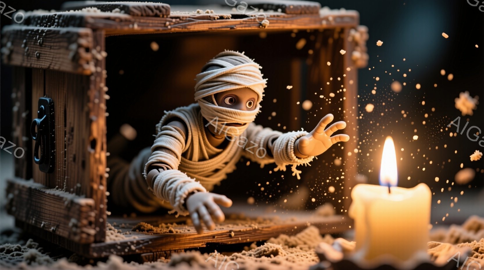古びた木箱からミイラのような人形が片手を伸ばして出てきています。人形は全身を包帯で覆われており、大きな丸い目が特徴的です。背景には雪のようなものが舞っており、箱の周りにはミイラの包帯のようなものが散らばっています。