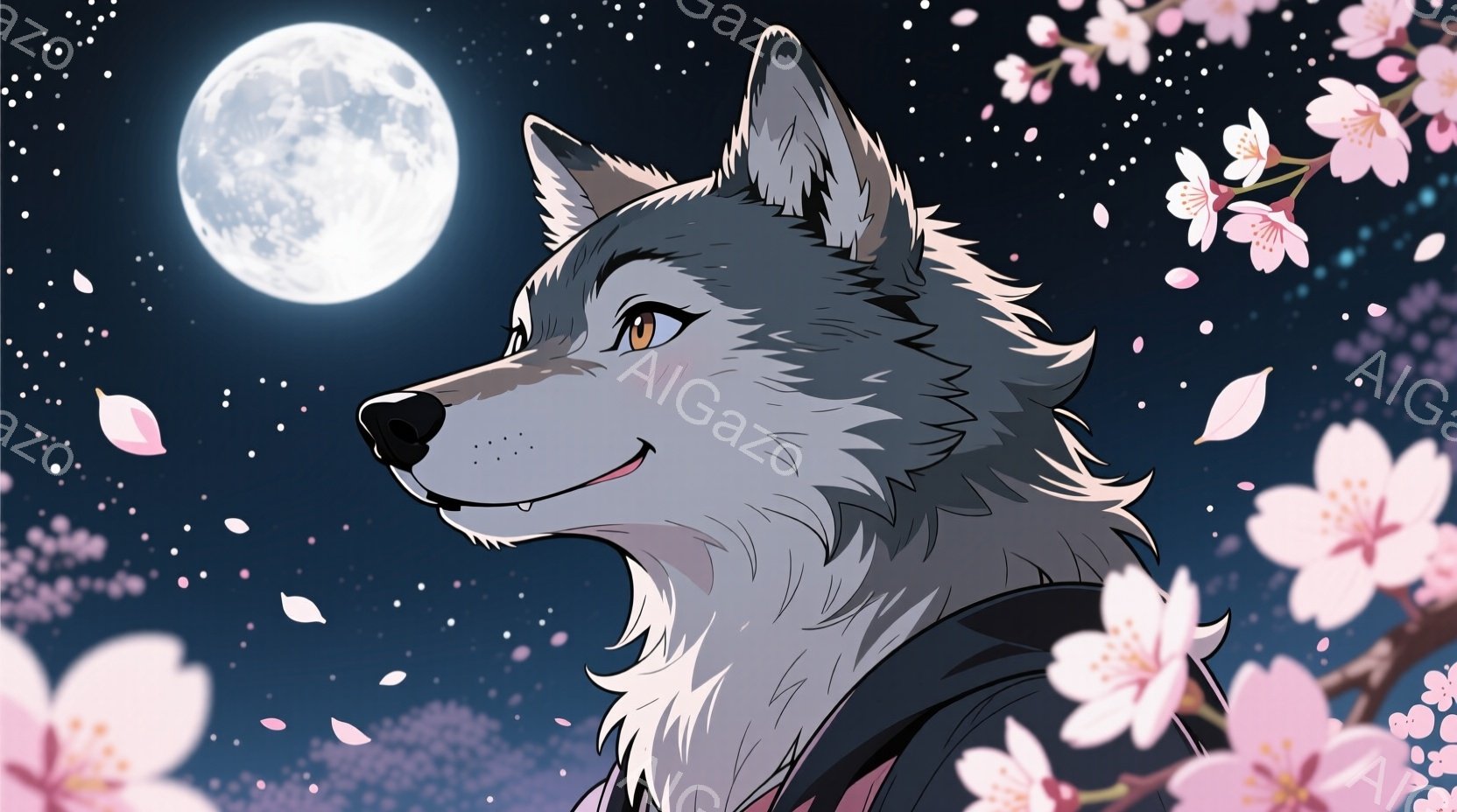 灰色の毛並みを持つ狼のキャラクターが、片方の目を少し閉じて微笑んでいます。黒い襟付きの衣服を着ており、背景には満月と桜の花びらが舞い散る夜空が広がっています。全体的に、穏やかで幻想的な雰囲気が漂っています。