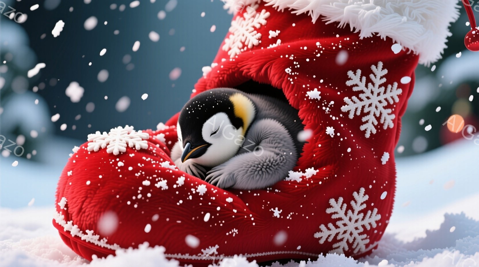雪の中に真っ赤なクリスマスソックスがあり、その中に愛らしいペンギンの雛が丸まって入っています。雛は目を閉じ、リラックスした表情で、ふわふわとした白い羽毛に包まれています。背景は雪景色で、遠くにはぼんやりと木々が見え、クリスマスの温かく、平和な雰囲気を醸し出しています。